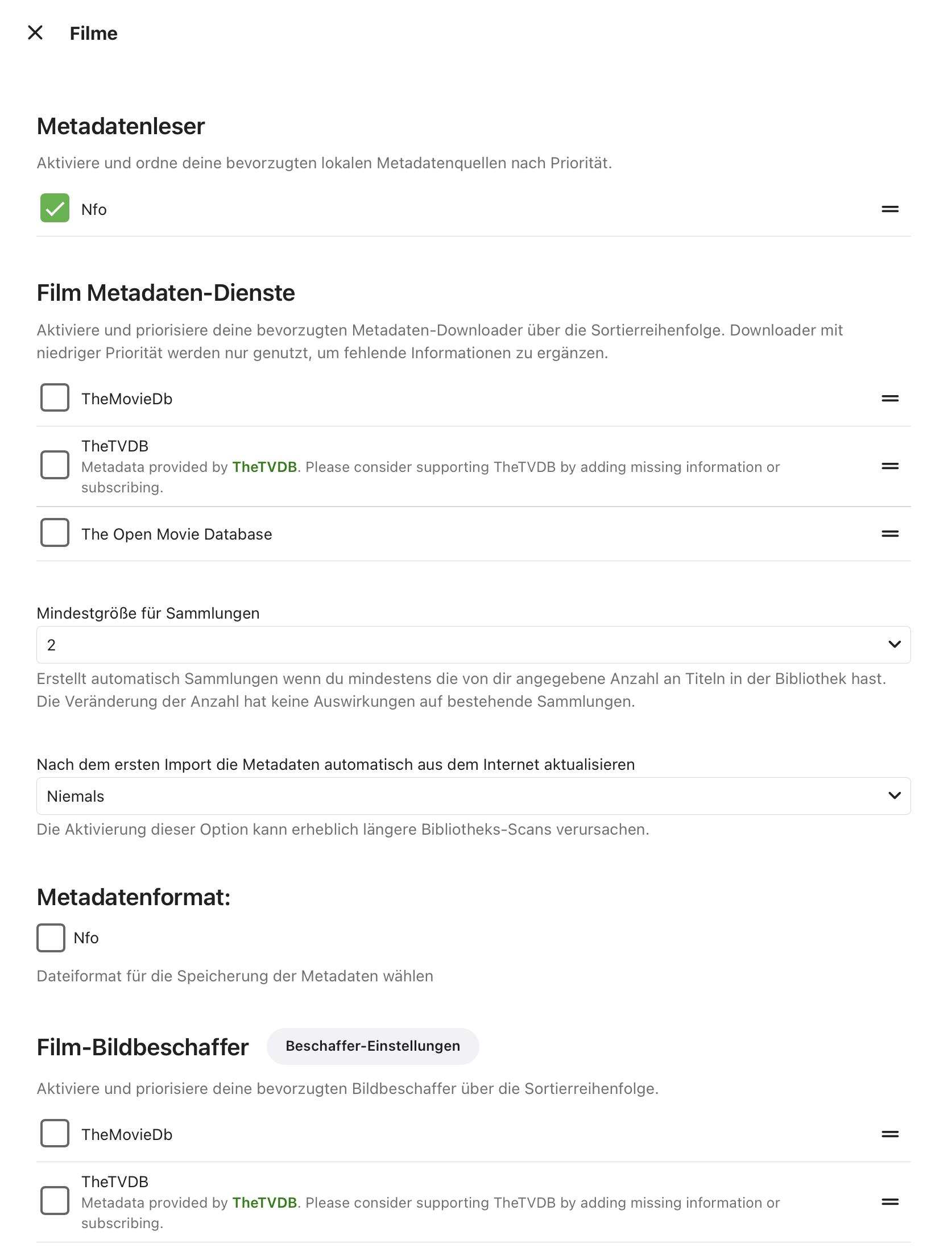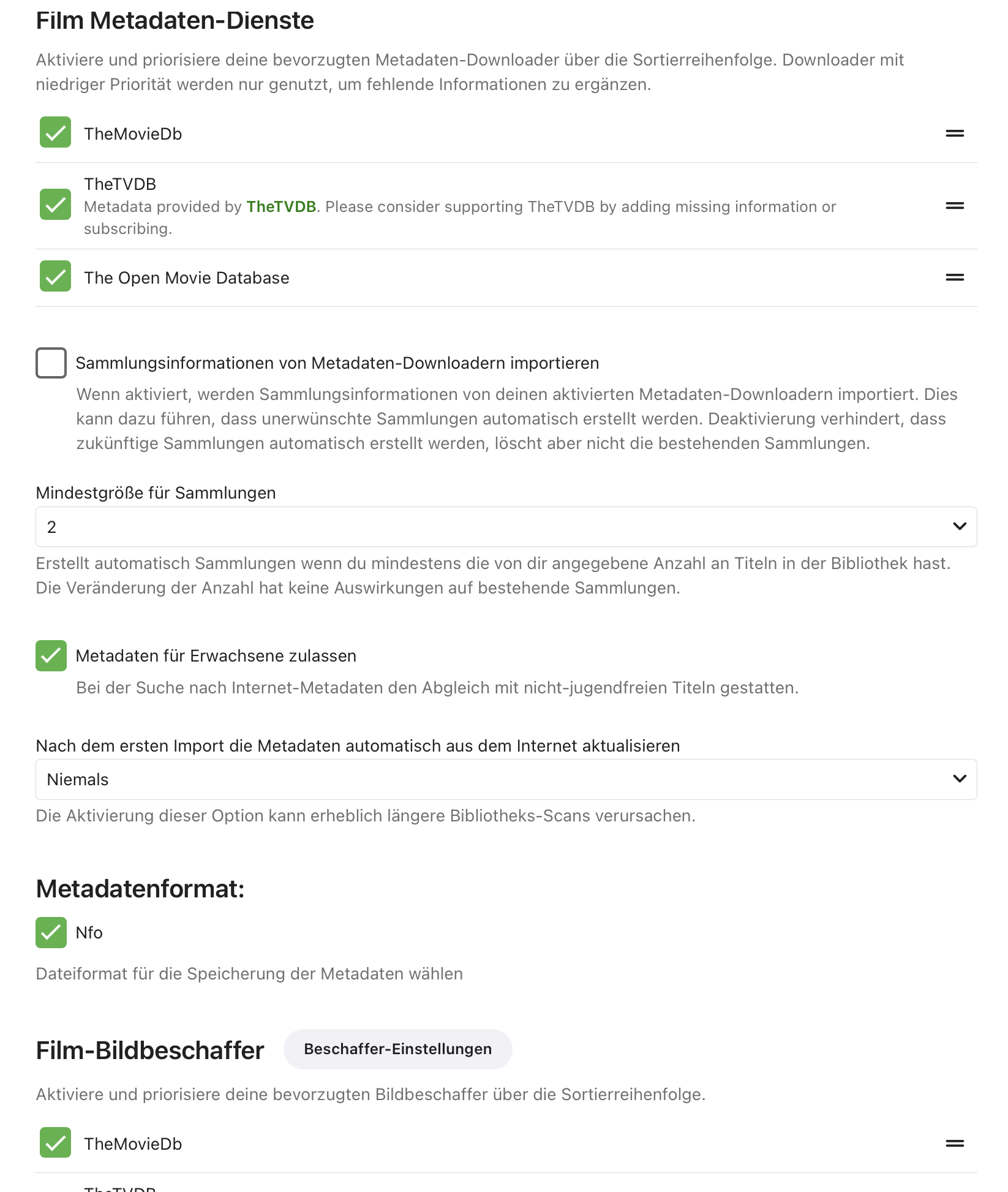 Happy2Play 9780 Posted October 7, 2024 Posted October 7, 2024 3 minutes ago, Workstation said: Emby loads them without any problems, but the next time I add a new movie, Emby scans and finds the movie, but overwrites all other NFO's in the media library. Sorry but do you have specific examples as Emby will ready existing data yes but yes has a specific format it is looking for and working with so may write that back to nfo file as no metadata managers are 100% the same.