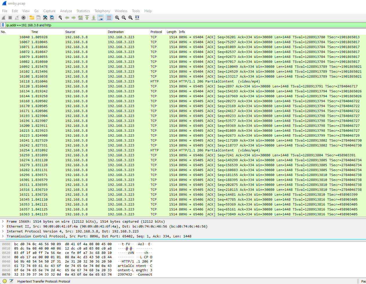 rbjtech 5284 Posted November 18, 2024 Posted November 18, 2024 14 minutes ago, SherlockLin said: Attached are two samples of 30 seconds of playback, the pcap of a normal video using the Mac client and the pcap of the problem video using the Chrome client (Traffic is normal when playing with Chrome) emby_normal_with_macos_client_30s.pcap.zip 34.9 MB · 0 downloads emby_normal_with_chrome_30s.pcap.zip 17.17 MB · 0 downloads Tks - will take a look later on today. This should provide a good idea on what is going on - but the simple fact the pcap file is twice as big suggests twice as much traffic/packets are being passed !