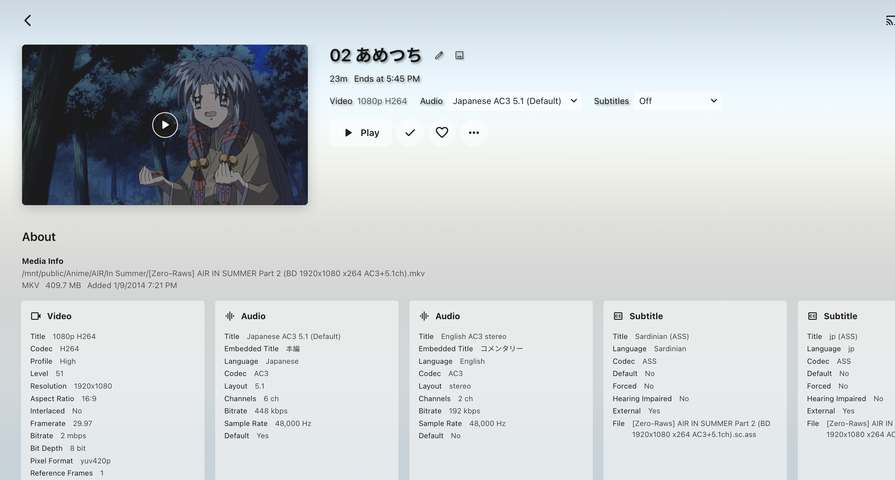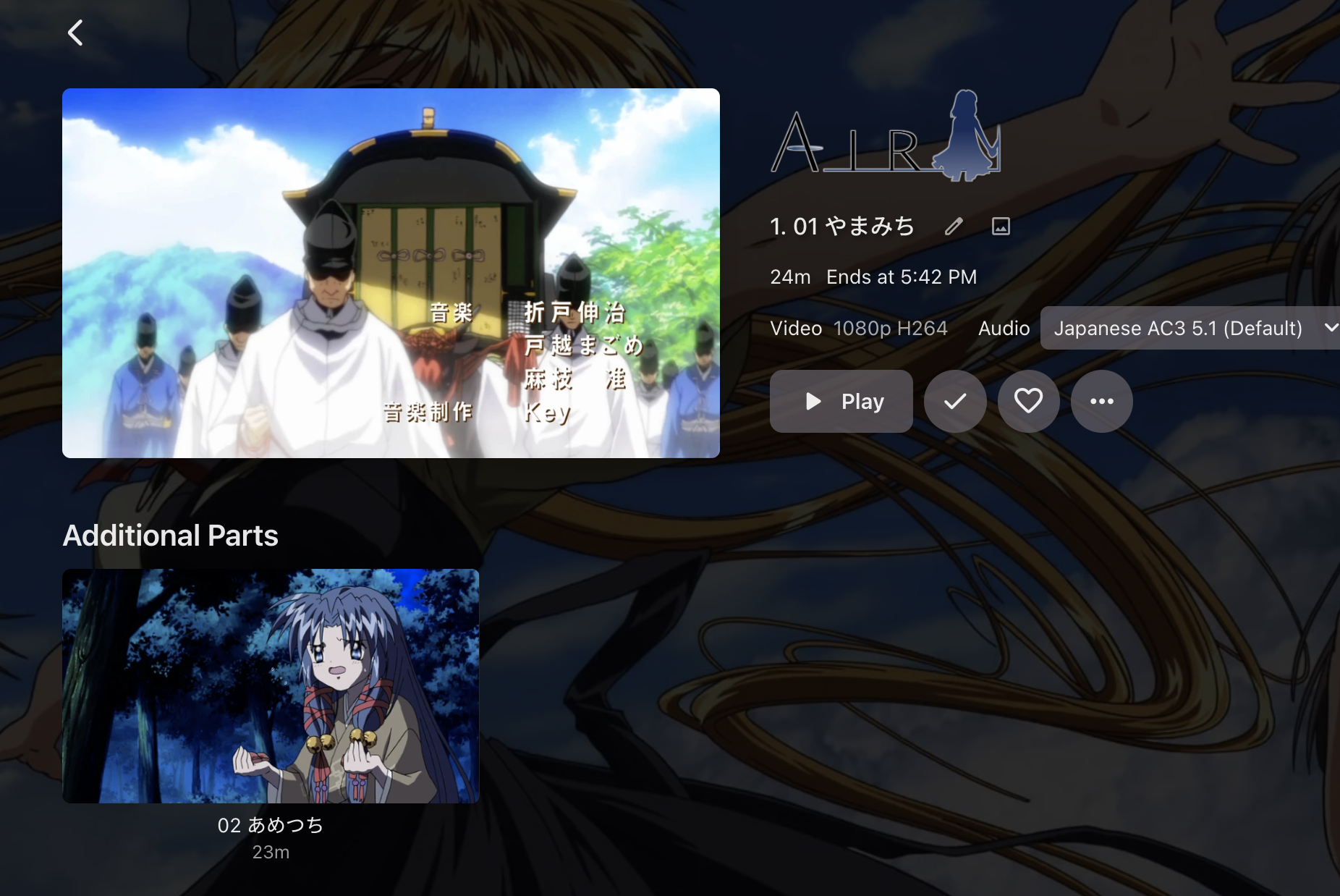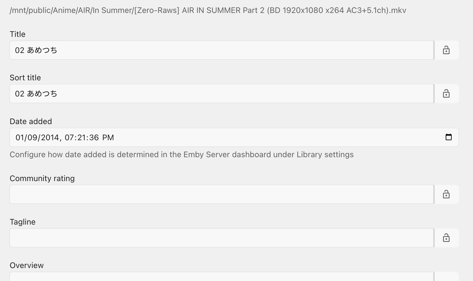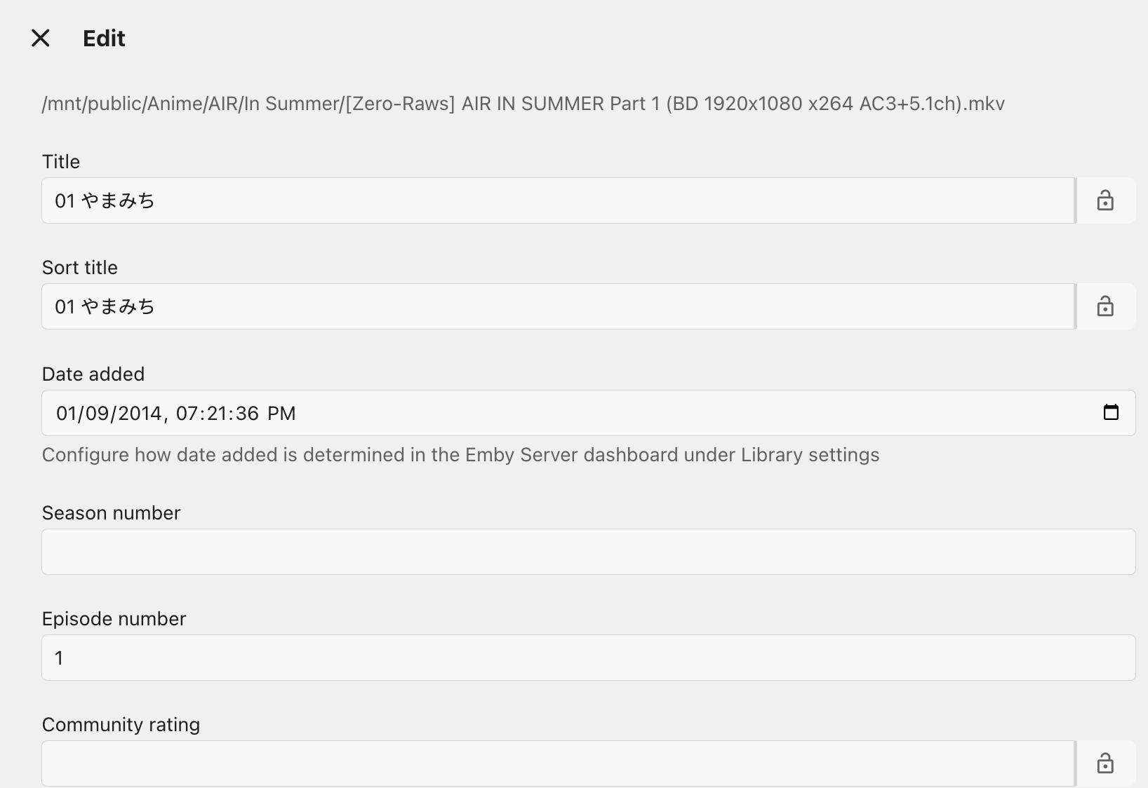 scegg 12 Posted October 17, 2024 Posted October 17, 2024 Hi. I have an anime which has several seasons. In one season, there is 2 video files. Emby recognized the 1st one but show the 2nd one as additional part under the 1st one. How to fix that? Tried to delete the whole library and rebuilt, still the same. In Emby, the season displayed like: Enter the 1st file, the view is: The folder contains these 2 files is: These 3 nfo files are also attached here. Any idea? Thanks a lot. [Zero-Raws] AIR IN SUMMER Part 1 (BD 1920x1080 x264 AC3+5.1ch).nfo [Zero-Raws] AIR IN SUMMER Part 2 (BD 1920x1080 x264 AC3+5.1ch).nfo season.nfo
