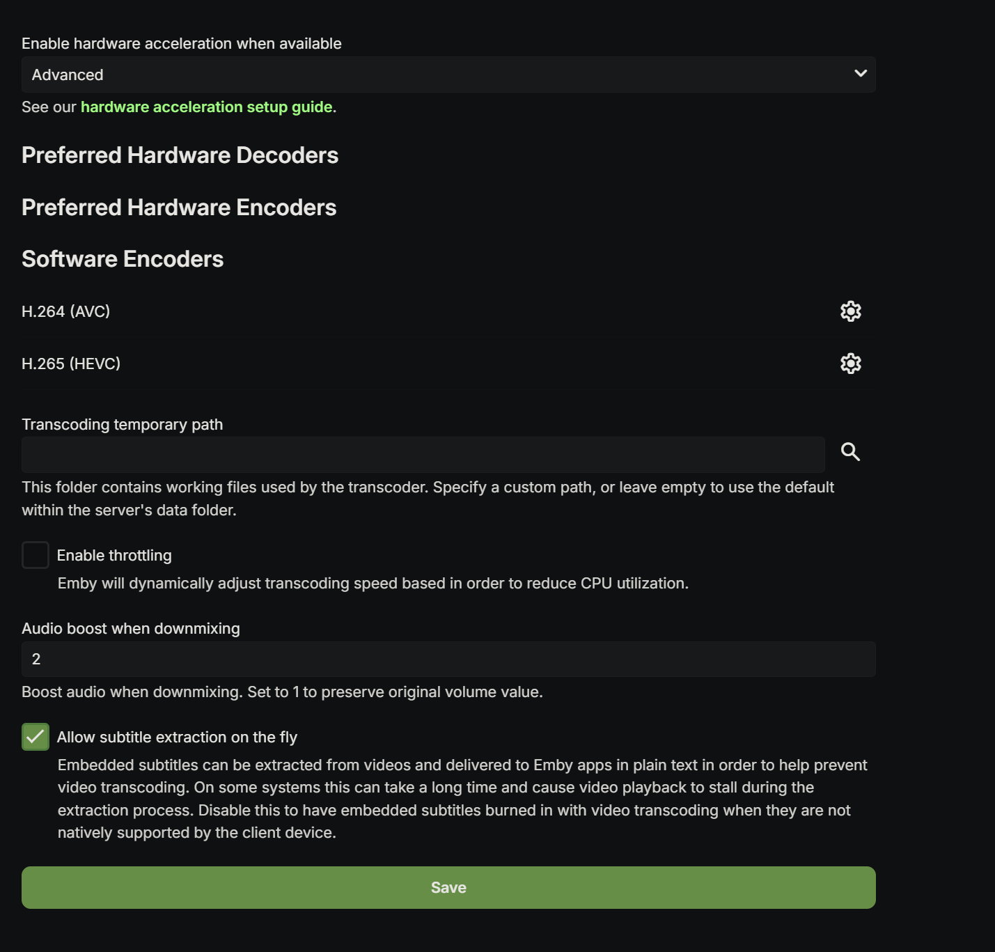 Happy2Play 9780 Posted October 20, 2024 Posted October 20, 2024 3 minutes ago, Jerren said: In the transcoding tabe the enable hardware acceleration when available is set to yes. What is shown on that page or if you change from Yes to Advanced as the log shows you have not Hardware and could be the TRUENAS config as you are running an older 4.8.1.0 server. All Software. >>>>>> Selected Codecs Decoder Automatic software decoder Encoder x264 Max Bitrate: 781 Mbit/s Color Formats: YUV420P, YUVJ420P, YUV422P, YUVJ422P, YUV444P, YUVJ444P, NV12, NV16, NV21, YUV420P10, YUV422P10, YUV444P10, NV20, GRAY8, GRAY10 - Bit Depths: 8, 10, 12, 14 Profiles: Baseline Profile (Level 6.2), Main Profile (Level 6.2), High Profile (Level 6.2), High 10 Profile (Level 6.2), High 4:2:2 Profile (Level 6.2), High 4:4:4 Predictive Profile (Level 6.2) >>>>>> FindVideoEncoder - MediaType: h264, UseHardwareCodecs: True, HWA-Mode: Automatic Info Checking: 'x264' Info Check successful - selecting 'x264' >>>>>> FindVideoDecoder - MediaType: hevc, UseHardwareCodecs: True, HWA-Mode: Automatic Info Checking: 'Automatic software decoder' Info Check successful - selecting 'Automatic software decoder' Probably need to see a server log from startup showing the hardware detect section and probably the hardware-detect log.
