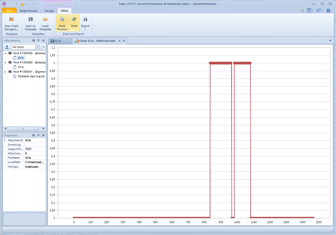 Guest Posted October 23, 2024 Posted October 23, 2024 5 minutes ago, softworkz said: You are right. In the video above, I had probed just 500 frames. But when I probe all ~1500 frames, there are in fact two periods with interlaced frames: And if that were a live stream, deinterlacing wouldn't be active either