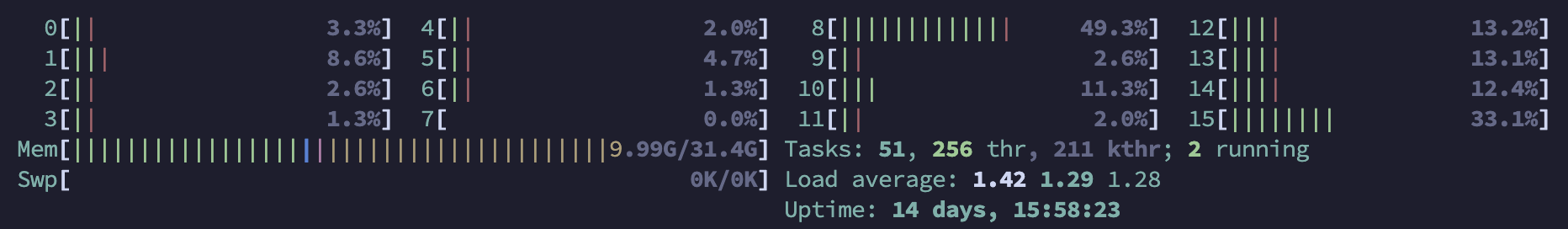 MissMakima 2 Posted January 17, 2025 Author Posted January 17, 2025 39 minutes ago, Luke said: OK if you need immediate relief you could always try the 4.9 beta server as there are some performance improvements there. Is that a performance-related problem? I'm using a VM with 16-core Intel Xeon Gold 6138 CPU and 32 GB RAM. The occupation of computing resources are relatively low right now.