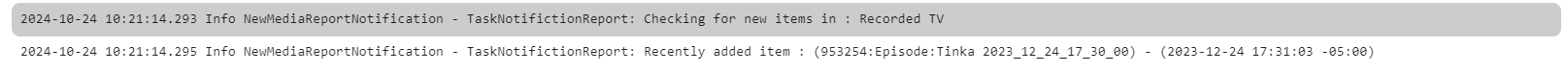 Teredactle 37 Posted October 24, 2024 Author Posted October 24, 2024 3 hours ago, Teredactle said: Ok so this workaround is not working - what I'm seeing is that this is actually not working. Notifications and emails ARE working as the tests are sent out; but there is a twofold problem here. 1.This setting below does NOT seem to target any media (photo/videos) in the libraries that are "Home videos & photos", which is really the only libraries I want added media notifications sent out for. When I look at the log files, I see that it looks at those libraries, but it shows nothing listed under them for new media, even though added tons of new media (and all that new media shows up on the home screen on the "Latest" feed). Not only that, but if I have "Library" "New Media Added", enabled, I do get an email notification for the new media added from those Home videos & photos libraries. 2.The other problem that I'm seeing, is that I get no notification at all as a New Media Report, even though I see that the log file shows that there is new media (below) So this is unclear to me. If I manually run the scheduled task again, it still shows the above as an added item in the log file. Does it not "reset" the findings; so the above line should not appear again in the log file when I rerun the scheduled task again, minutes later (or anytime later). I don't really know how this works, so maybe it's my misunderstanding, but I assume that when you run the "Playback Reporting - New Media Notification" task, it will check for new medias added from the last time it ran. So the log lines should all show no entries for new media. I just manually ran it again, and it's still showing the same entry, check out the time stamp. @Lukecould you please confirm either way, to me it looks like this isn't working correctly. Thanks! @TeamB, Luke has suggested that you may be able to chime in on the above workings of the notifications combined with this plugin - I hope you don't mind me tagging you. If it's better, I can crosspost into the plugin thread. Thank you!
