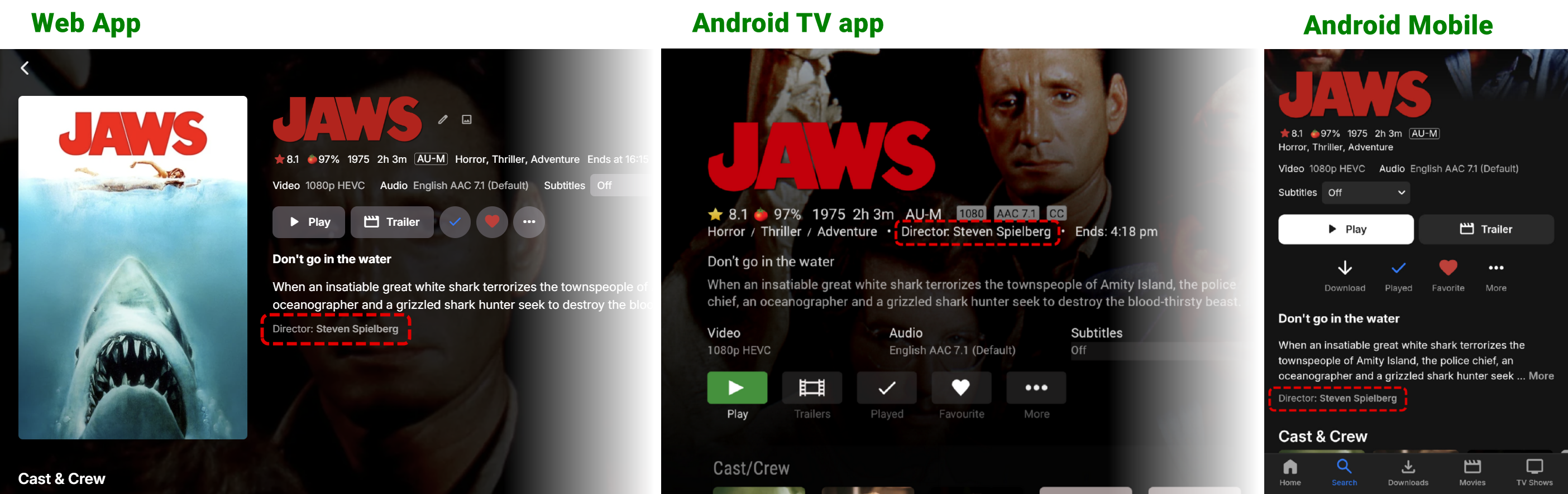 seanbuff 1313 Posted August 6, 2025 Posted August 6, 2025 5 hours ago, Luke said: Hi, what platforms are not consistent? @Lukeas noted by others, the newest app layouts are inconsistent with the long standing ones. Example of existing apps where the Director is clearly shown, and often clickable (minus ATV app) Example of new app layouts where the Director is notably missing from the same screens. The ask is that for both Android and Windows (TV Mode) - the Director is displayed AND clickable allowing for a quick "jump to" page Thanks. 4