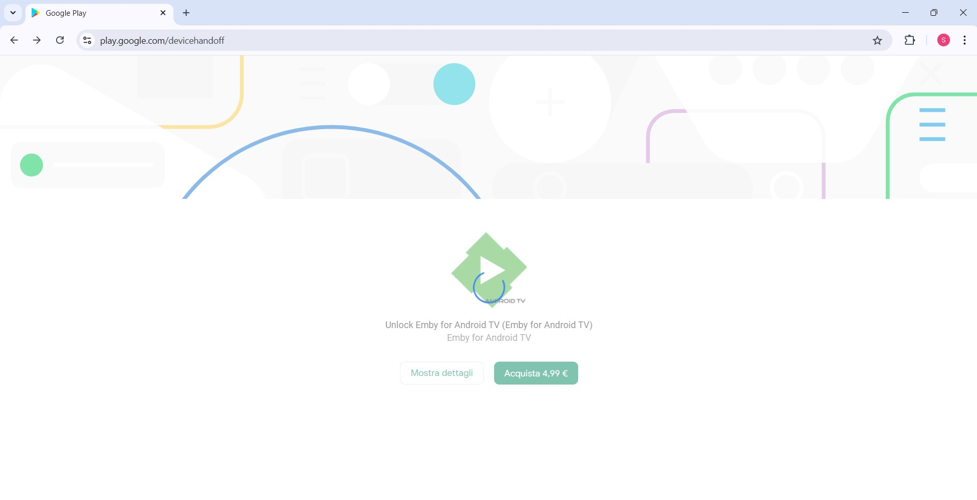 Se apro il link dal mio notebook Windows la pagina si carica e mi mostra una schermata con scritto "Unlock Emby for Android TV" €4,99.