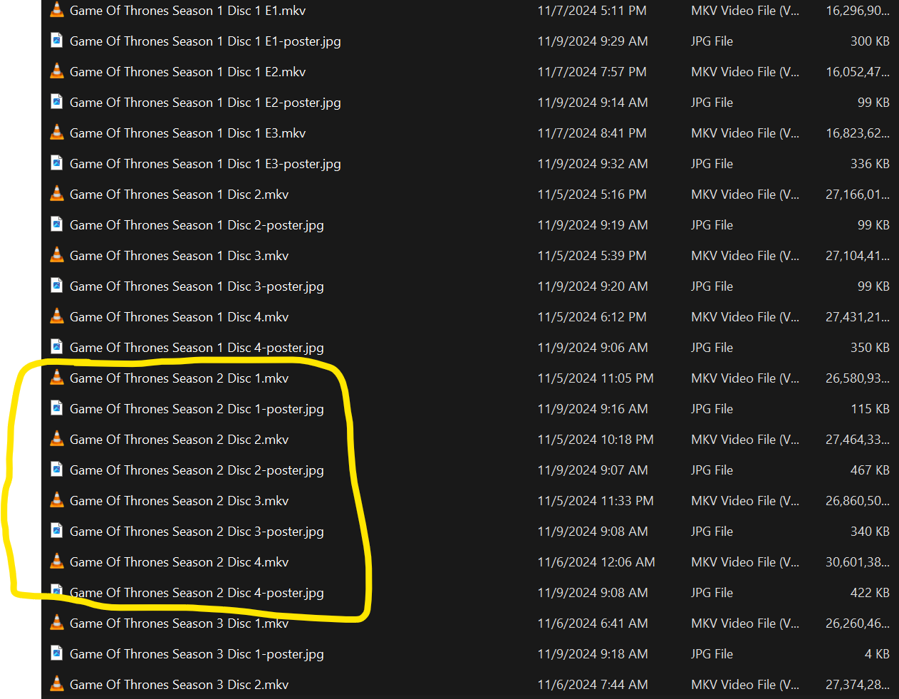 Arielgon 1 Posted November 9, 2024 Posted November 9, 2024 Why is Emby not recognizing loading some episodes on my server. Specifically Game of Thrones Season 1 Disc 2, 3 and 4. It loaded Disc 1, but not the others and as you can see in the names of the file they are all labeled in the same format/ Thanks for the help in advance
