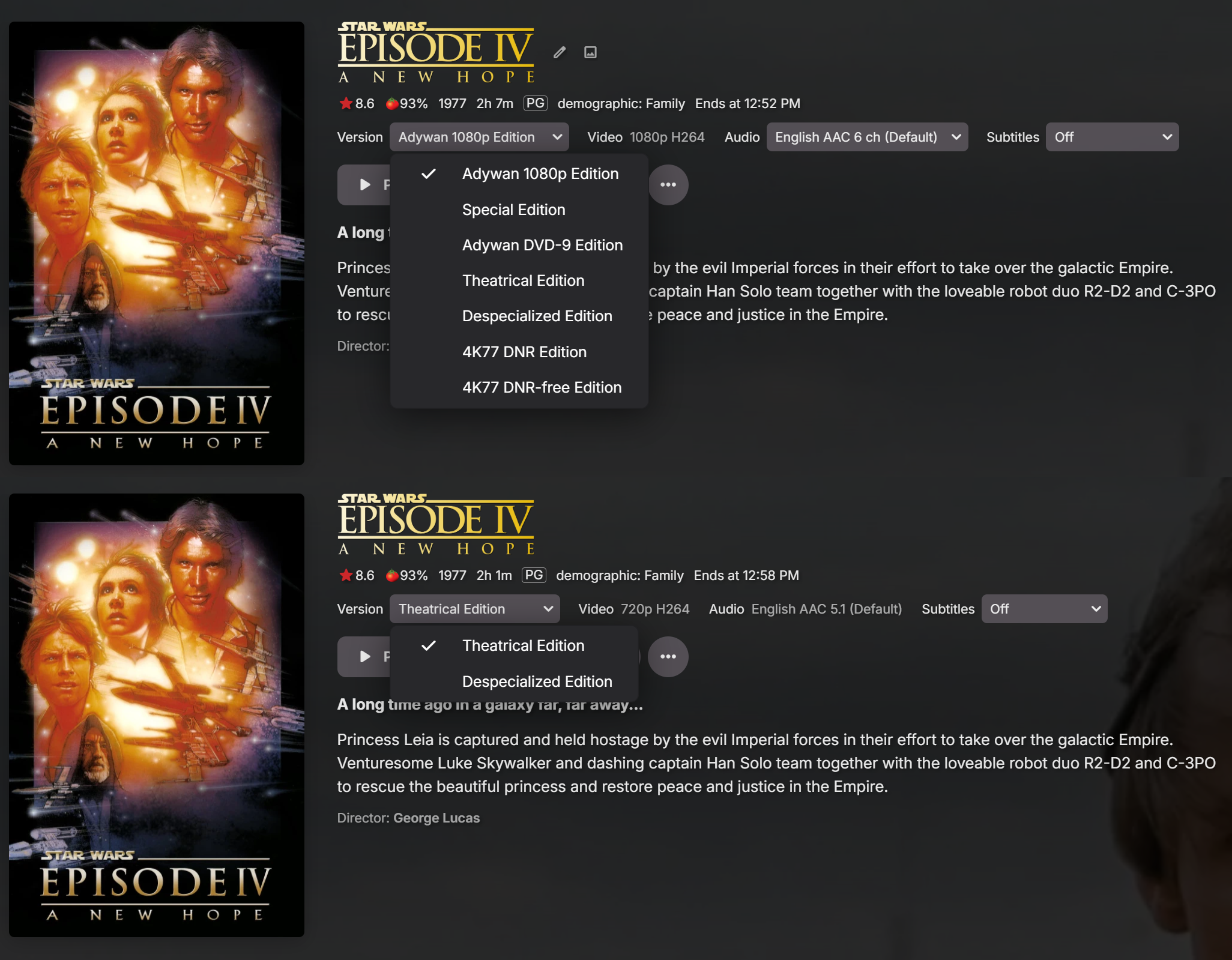 Losey 4 Posted November 14, 2024 Author Posted November 14, 2024 On 11/13/2024 at 3:33 AM, sa2000 said: Could you give some actual examples, with screenshots of the tags used and what is set for the users Also server log when the general user is not seeing all versions of a movie. Please give details, screenshot, date/time We have a limit of only displaying a maximum of 8 versions for a media item There were issues before with tags and these have been addressed. I am not sure if all the fixes are in the public 4.8.10.0 release or still only in the beta (currently 4.9.31.0) 12 hours ago, Luke said: @Losey? Apologies for the delayed response, been a crazy week with all kinds of fires to put out. Quite a lot to load up here, so I'll do my best! Here's a screenshot of the same movie viewed from the Admin and General accounts respectively. I'll get a copy of the metadata and server log up tonight, but I have no tags on any version and all versions are the same Parental rating. These screenshots were taken just now, and I am running the latest public version of Emby.