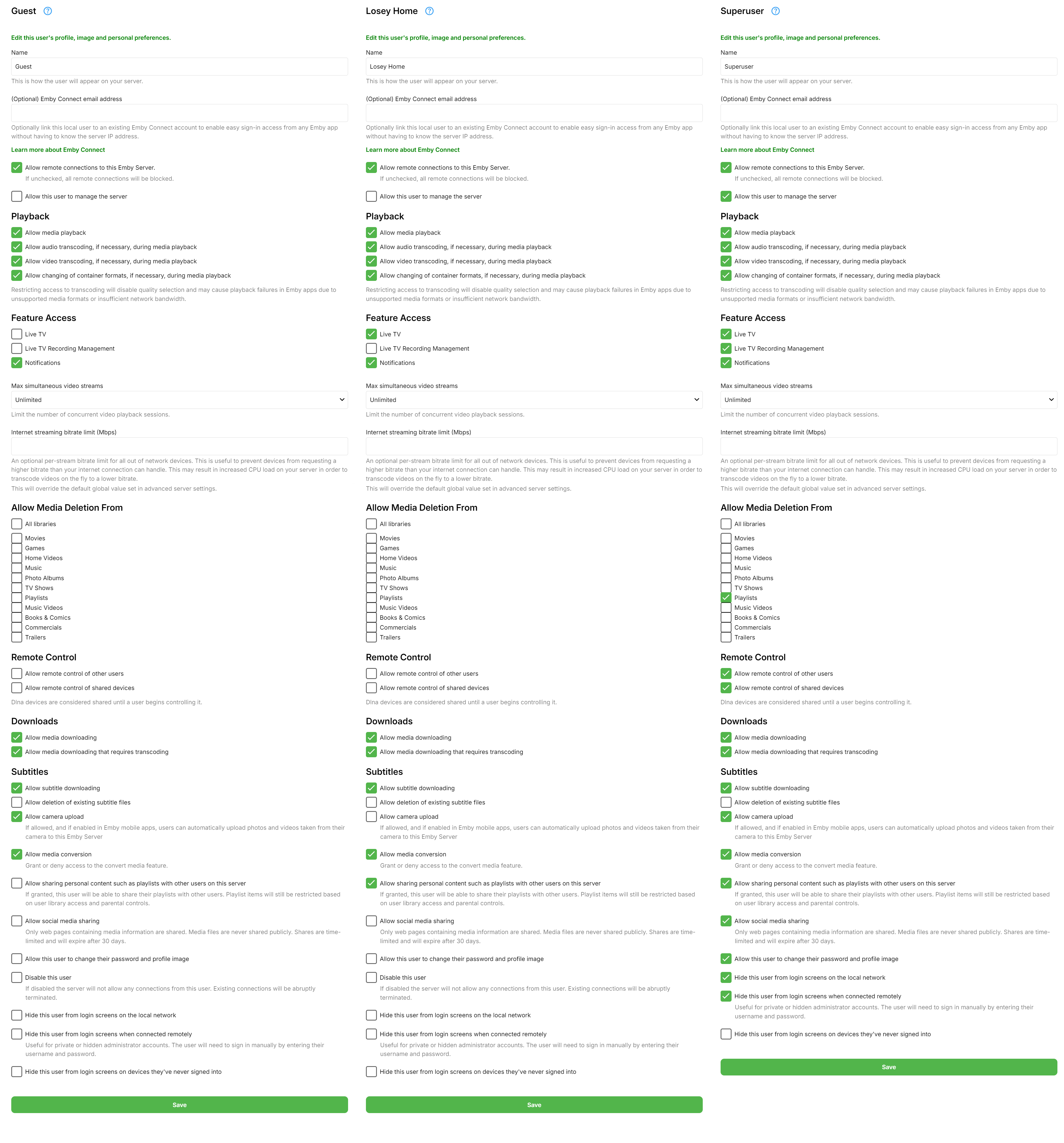 Losey 4 Posted November 15, 2024 Author Posted November 15, 2024 8 hours ago, sa2000 said: Thank You. So what you are saying with no tags being used, the server admin user sees 7 versions but non server admin user sees only 2. and please when providing the logs, indicate what times the screenshots are taken - so can then relate to the relevant timestamps in the logs Please can you compare the settings for the two users - other than the server admin rights - check Access tab Are all the versions in the same folder? I have screenshotted each of the three users' settings and their respective parental control settings. And yes, all the files are in the same folder, as pictured below. Here are the server log files from immediately after checking the video through the web interface and restarting the server. embyserver.txtembyserver-63867209436.txthardware_detection-63867209496.txt 8 hours ago, rbjtech said: ? There is no concept of 'admin rights' for the file system wrt emby - all file access will be done using whatever account loaded emby. In other words - this is an emby database/configuration issue - it is not related to file share access if it works on one account and not from another. Indeed, I'm not meaning to imply that. I simply have configured the "Superuser" account as being the only one allowed to edit metadata, and have it hidden.