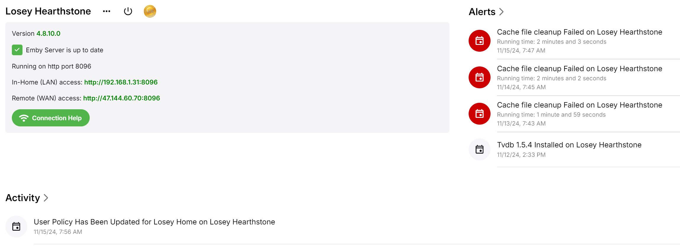 sa2000 674 Posted November 19, 2024 Posted November 19, 2024 On 16/11/2024 at 02:51, Losey said: Here are the logs! Thanks. What are the logs supposed to cover ? what issue? It is only for 2 minutes : 15th November from 6:47 pm to 6:49 pm With the regards to the cache cleanup errors, they were 12 hours earlier. Suggest getting all the embyserver-xxxxxxxxxxx.txt log files as well By default Emby Server keeps 3 days log files