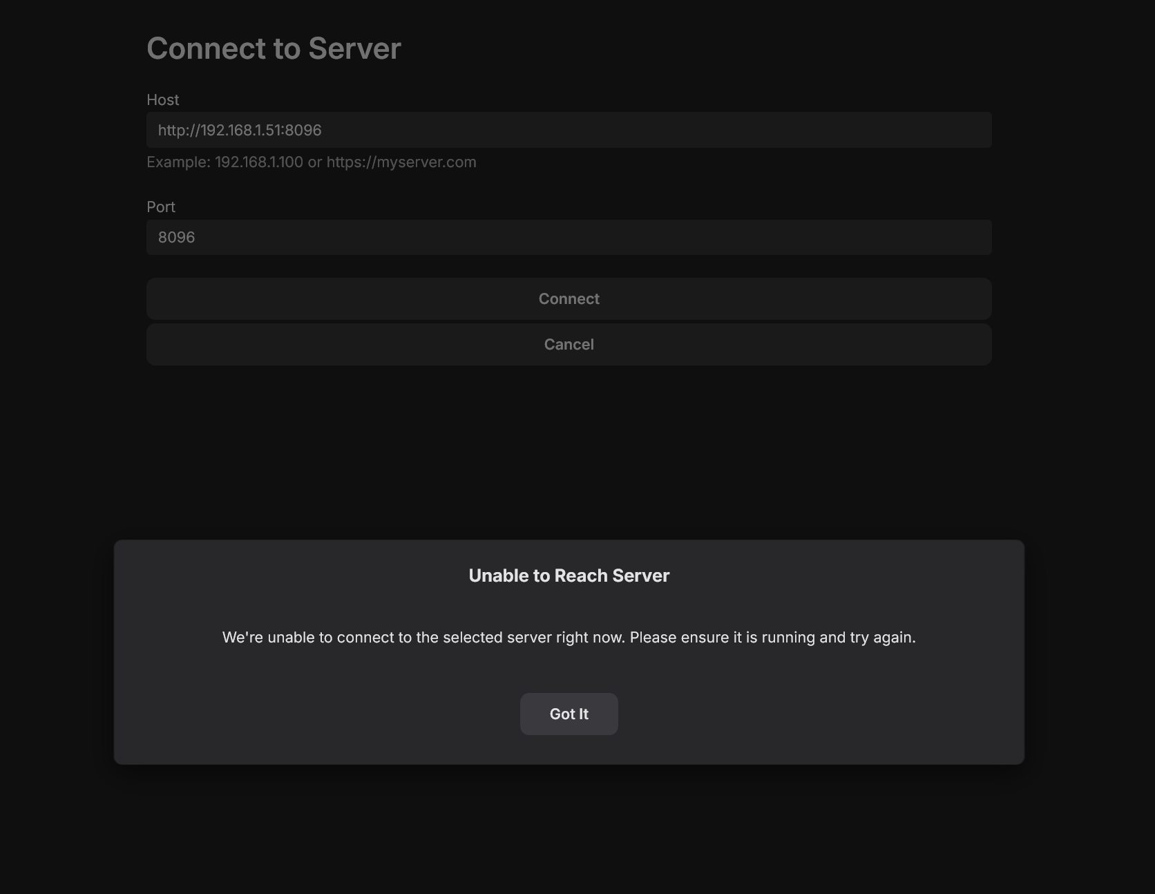 Neminem 1519 Posted November 13, 2024 Posted November 13, 2024 Is this from the same machine as server ? Can you access the server from a browser, on the same machine as you try with Emby Theatre app ?