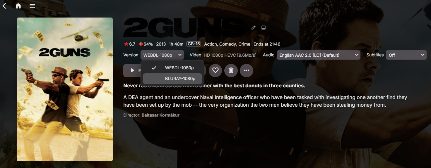 rbjtech 5284 Posted November 15, 2024 Posted November 15, 2024 (edited) I just tried my last suggestion out of curiosity - and it works just fine. So after creating a stub file (see below) it appears as a multi-version file. Depending on the client - I'm sure it used to say something along the region of 'insert the disk to play' but on the web client, it just errors if you attempt to play the 'disc' version. File naming - Folder name MUST be the same as before the '-' Folder name = 2 Guns (2013) Digital file = 2 Guns (2013) - WEBDL-1080p.mkv Stub file = 2 Guns (2013) - BLURAY-1080p.disc Create the .disc file as a .txt file (in notepad etc) and then rename it. Edited November 15, 2024 by rbjtech