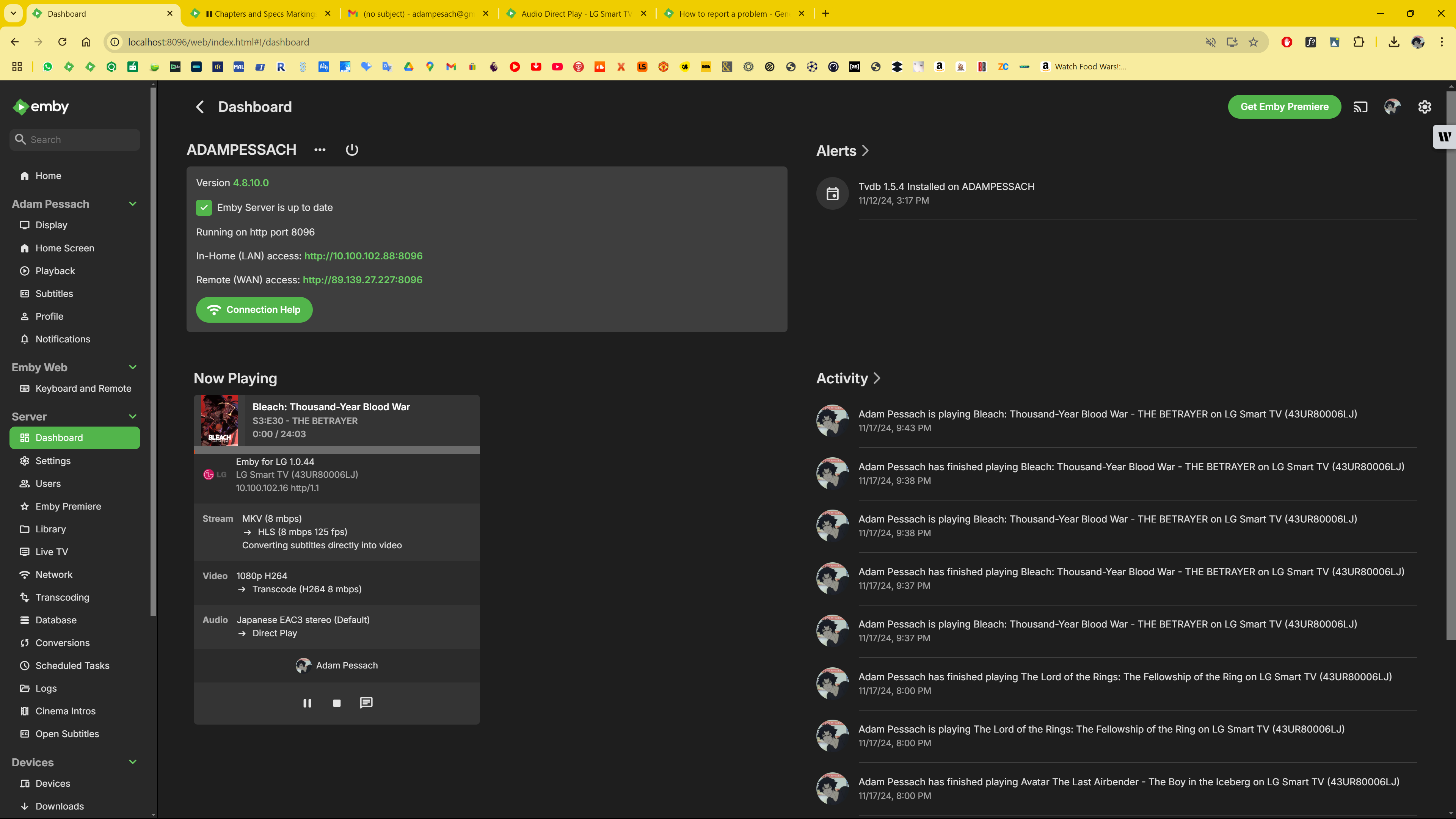 SamES 1056 Posted November 17, 2024 Posted November 17, 2024 58 minutes ago, Adam Pessach said: ASS and PGS always cause transcoding to the video while the "allow subtitle extraction on the fly" option is not checked. Yes, that's why I suggested that you must have something changed as normally transcoding for ASS wouldn't normally be the case. if you avoid transcoding ASS then you will also avoid the container change will prevent the PCM issue you are seeing. It isn't a fix for the audio problem, but it avoids the issue that is causing the audio problem. 1 hour ago, Adam Pessach said: The problem I'm dealing with is that the audio track is converted to a different codec, although it can be played directly But this is not something that Emby is doing, it is something the TV is doing between it and the soundbar. The log file shows that EAC3 audio is the only one being sent and it is a direct copy. 21:38:13.660 Stream #0:1 -> #0:1 (copy) 21:38:14.215 Stream #0:1(jpn): Audio: eac3, 48000 Hz, stereo, fltp, 224 kb/s (default)