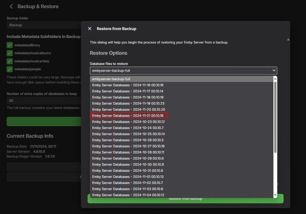 robsch 45 Posted November 21, 2024 Posted November 21, 2024 7 minutes ago, Neminem said: @robschThis look fun, you are not keeping any backups What happens if you press restore ? Mine did a backup today, i'm kepping 30 days. I had it to 10, but I changed it to 0, which I thought might of been "Unlimited" I have no options to restore anything. I changed it to 10, restarted Emby, and still get the same exact error.