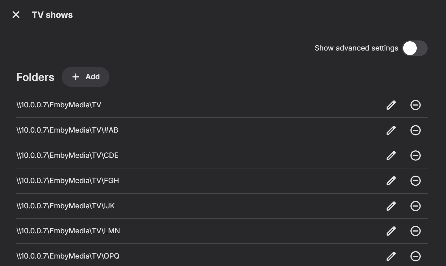 GrimReaper 4740 Posted November 23, 2024 Posted November 23, 2024 3 hours ago, keithwalker80 said: Here is the screenshot of the library setup in Emby as requested. You should remove root \\10.0.0.7\EmbyMedia\TV from library folders as that one is likely breaking your setup. 1
