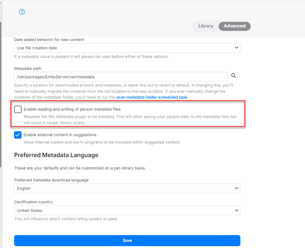 davidawarner 12 Posted November 25, 2024 Author Posted November 25, 2024 48 minutes ago, rbjtech said: In the Emby library - there are options for NFO files. These are read/written alongside the media files allowing the data to be portable with 3rd party apps. If you have used the option to write 'save artwork into media folders' (in the library options) then all associated files get stored with the media. This may be the step you are missing to see these files ? So in the example below - the highlighted NFO file contains all (or the majority anyway) of the information that the emby db contains. That NFO file format is an industry standard XML type file that can be used/shared with the likes of media managers, arrs, plex, jf etc It also works the other way (again, set the option in the library) to READ that NFO file - ie I can add details from other apps - and emby will try and use it if it has the database field to do so. ie tags for example. Would you be referring to this setting in the Library selected in RED? Not sure if I am following so please educate me. The goal is to have EMBY write inside the media file - mp3, mp4, avi, etc so that the tags are present when viewing the description. This is one of my CDS that I encoded and have stored on my NAS. We can see ID3V1 where it is not tagged at the file level. But at the EMBY level I am able to see the meta data. From what you were saying is that the .nfo data would be exported and then read into third party programs. This is the behavior I wish not to utilize but to have EMBY itself tag the media file direct. Please advise and if we need to setup a quick meeting for better understanding that would be an option. Thank You Dave