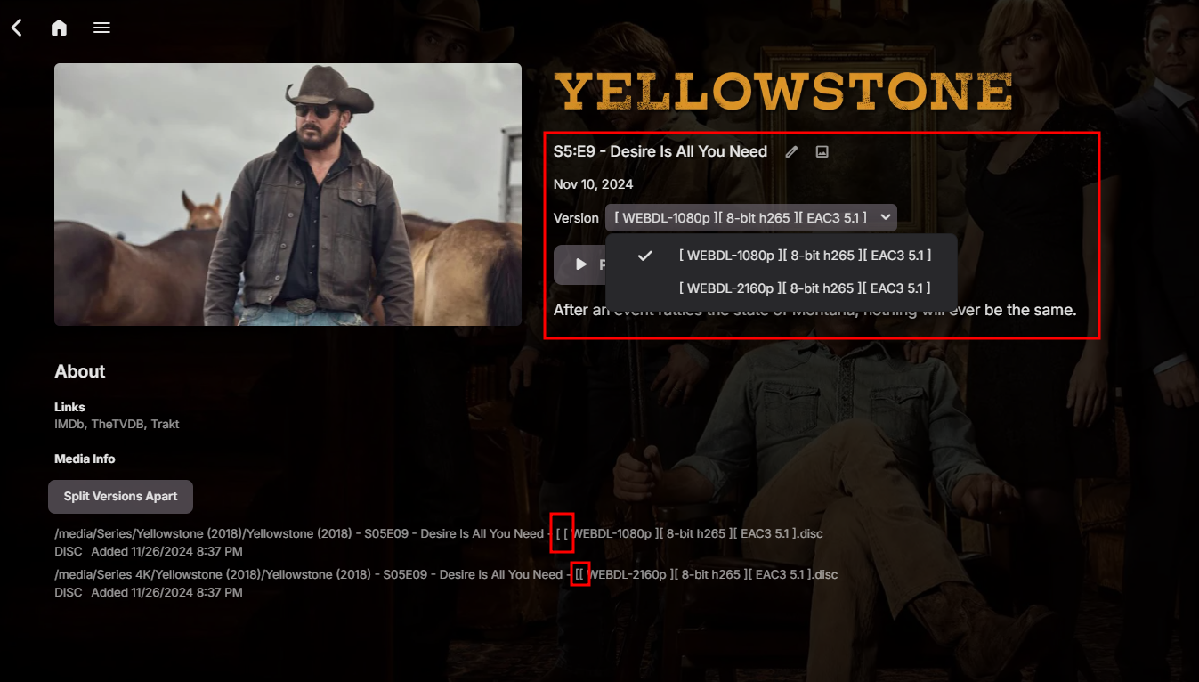 Neminem 1518 Posted November 26, 2024 Posted November 26, 2024 Hmm just testing something with your file naming. I think I found a in the beta server when testing you naming. But that's not a talk for this issue. But it look like you naming is good. Yellowstone (2018) - S05E09 - Desire Is All You Need - [ WEBDL-1080p ][ 8-bit h265 ][ EAC3 5.1 ].disc Here it is without the extra "space" on beta.
