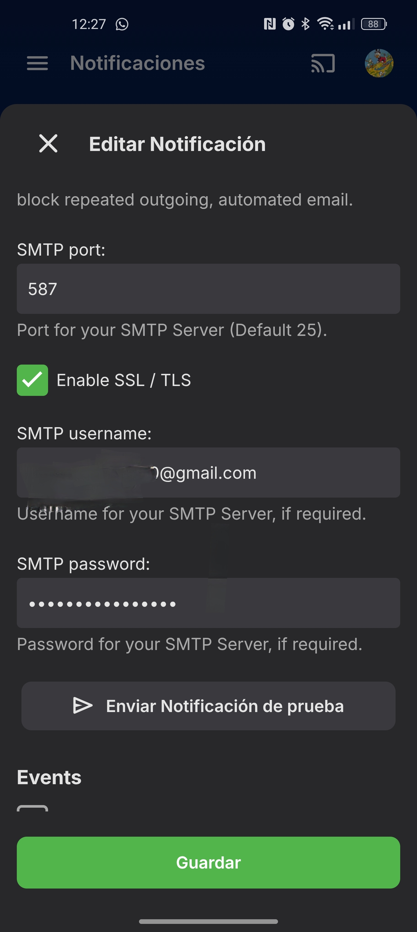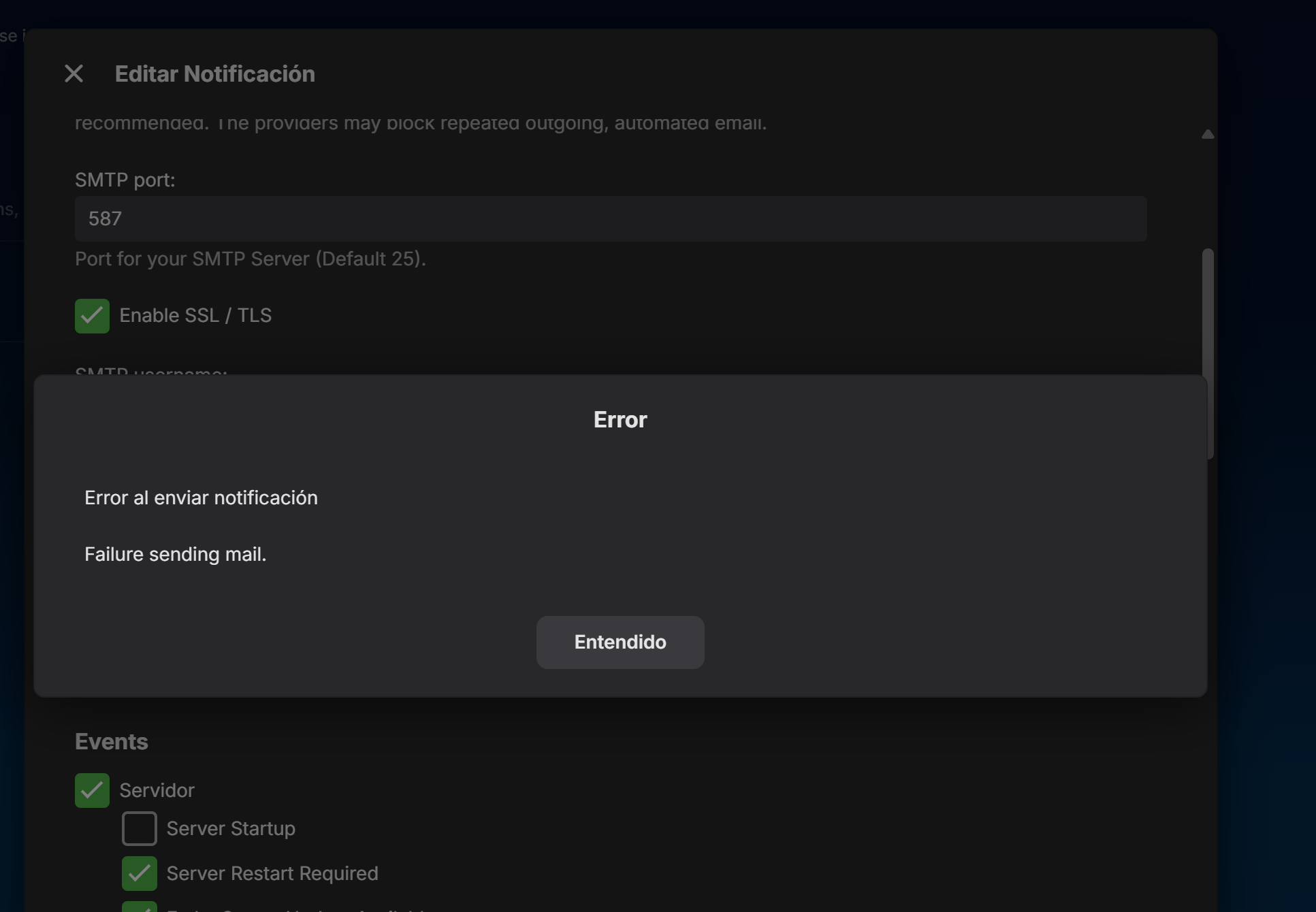 Parpatrus 6 Posted February 15, 2025 Author Posted February 15, 2025 51 minutes ago, Banquero said: Ahí la tienes Raro que no te funcione. Yo probaría. desinstalar el plugin, reiniciar el servidor, volver a instalar y reiniciar el servidor, antes de poner ningún dato, ir a Gmail, eliminar inicio en dos pasos, eliminar clave que tenga generada, volver activar verificación en dos paso y generar nueva clave de aplicación, un vez lo tengas configuras y en email to: pones tu dirección de email y te mandas una notificación de prueba. yo he realizado esos pasos y me funciona. Ya contarás 1