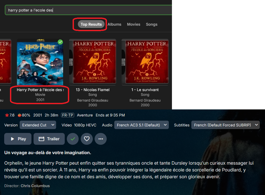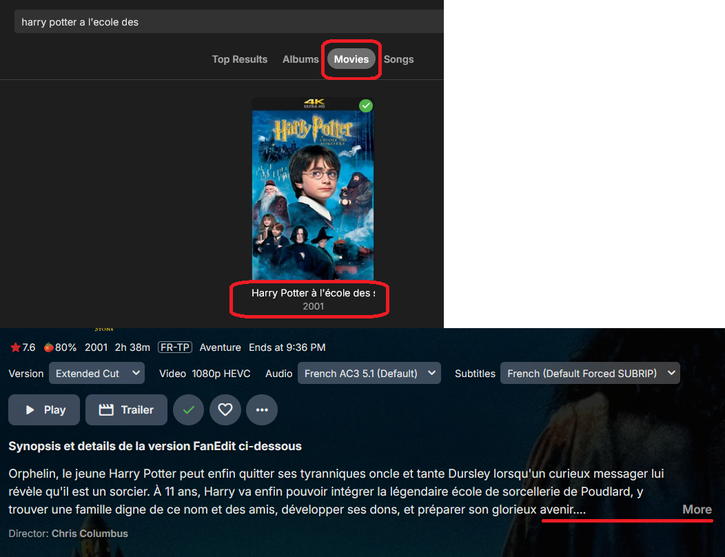 Okeur75 7 Posted December 5, 2024 Posted December 5, 2024 Hello, Situation : Version 4.8.10.0 A movie with 2 version : Theatrical and Extended. I've edited the synopsis from the GUI because I wanted to highlight the difference between the versions for the users. Everything displays correctly once I click save. Now, click on Home and search for the same movie. If you click on the movie in the top results tab, the default nfo is displayed. If you click on the movie in the movies tab, the edited nfo is displayed. @Happy2Play Observation: In my case I've seen that the NFO file of the Theatrical version is the one being modified from the GUI. The NFO of the Extended version is still unmodified. So it looks like the top results tab is reading the Extended NFO while the movies tab is reading the Theatrical NFO. Expected results: A change in the synopsis, and more generaly in anything written in the NFO file should be propagated to all versions of the movie. Workaround: Edit manually the unedited nfo. Screenshots attached to make more sense. In my case we can see when clicking on the movies tab and then on the movie that the synopsis offers a "more" button because I've added the detail of the extended version. Edited NFO of the Theatrical version: root@emby:/Emby-Libraries/Movies/Harry Potter and the Philosopher's Stone (2001)# cat Harry\ Potter\ and\ the\ Philosopher\'s\ Stone\ \(2001\)\ -\ Theatrical\ Cut.nfo <?xml version="1.0" encoding="utf-8" standalone="yes"?> <movie> <plot><![CDATA[Orphelin, le jeune Harry Potter peut enfin quitter ses tyranniques oncle et tante Dursley lorsqu'un curieux messager lui révèle qu'il est un sorcier. À 11 ans, Harry va enfin pouvoir intégrer la légendaire école de sorcellerie de Poudlard, y trouver une famille digne de ce nom et des amis, développer ses dons, et préparer son glorieux avenir. <br /><br />Deleted scenes included in the extended version of Harry Potter and the Sorcerer’s Stone:<br /> Dudley’s New School Uniform - (00:53);<br /> Petunia Cracks Egg with Letters Inside - (00:37);<br /> Tube Ride - (00:38);<br /> Snape Classroom (Extended) - (01:30 extended);<br /> Kids Leave Girl’s Bathroom - (00:20);<br /> Harry Sits by Fire in Great Hall - (00:59);<br /> Harry Find Nicolas Flamel Card - (01:54);<br />]]></plot> Default NFO of the Extended version: root@emby:/Emby-Libraries/Movies/Harry Potter and the Philosopher's Stone (2001)# cat Harry\ Potter\ and\ the\ Philosopher\'s\ Stone\ \(2001\)\ -\ Extended\ Cut.nfo <?xml version="1.0" encoding="utf-8" standalone="yes"?> <movie> <plot><![CDATA[Orphelin, le jeune Harry Potter peut enfin quitter ses tyranniques oncle et tante Dursley lorsqu'un curieux messager lui révèle qu'il est un sorcier. À 11 ans, Harry va enfin pouvoir intégrer la légendaire école de sorcellerie de Poudlard, y trouver une famille digne de ce nom et des amis, développer ses dons, et préparer son glorieux avenir.]]></plot> Regards