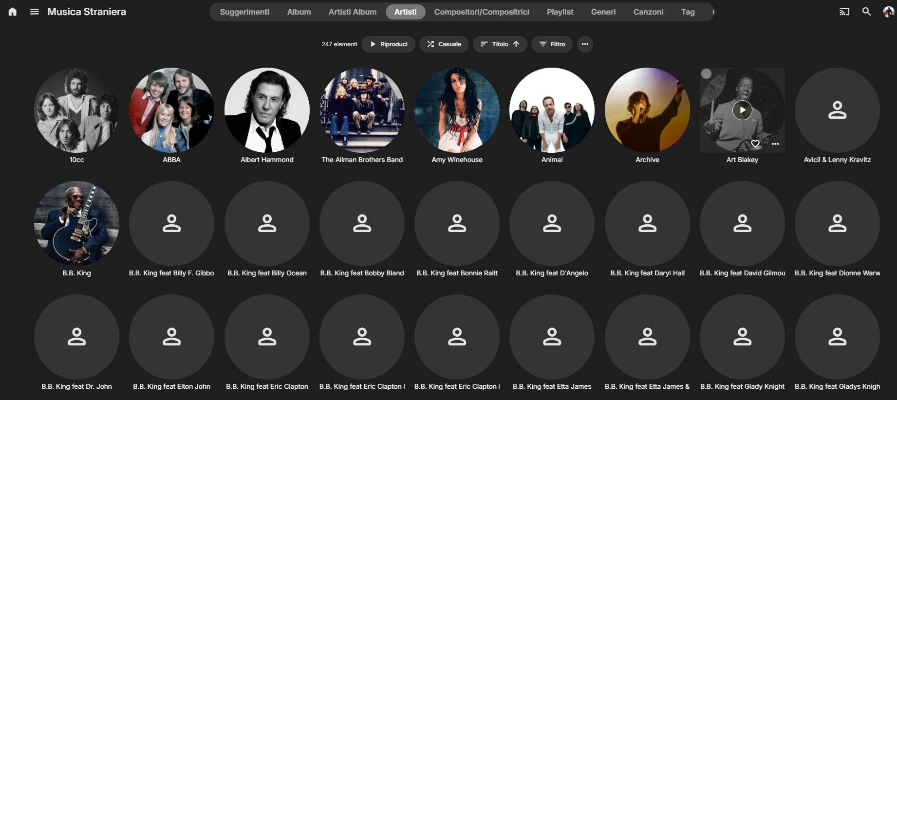 Pietrogramma 3 Posted December 6, 2024 Posted December 6, 2024 Hi everyone, I have many audio tracks where, using the MP3Tag software, I have inserted the main author under the Author heading and any other participants in the music session, under the "Album author" heading. I therefore created a library on Emby with all these music files, but sorting the files based on the author. also includes the information I put on "author of the song" in the list. I attach a photo where you can see that, despite having chosen the order based on the author, it then inserts a whole series of other information relating to the TAG author of the song (see B.B. King feat... for example). How can I have only the songs classified based on the author and not also those based on the Author of the Song? I hope I explained myself well. Thanks very mutch and ciao