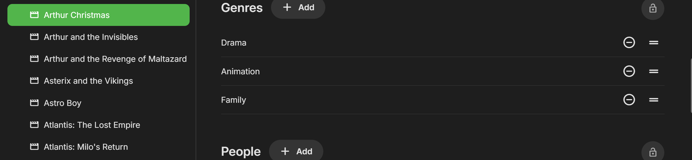 PeteD 3 Posted December 6, 2024 Posted December 6, 2024 Last year I added 'Christmas' as a genre to all my Christmas films and set the lock on the metadata. Over time those films disappeared from my Christmas Genre view. I tried again this year so on the 22nd November I set 10 films: This is how 'Arthur Christmas' and all the others looked when I set it (saved & padlock set): Today I found the same thing had happened again and I have just 5 films in the Christmas genre: 'Arthur Christmas' & the other missing films have lost the genre & the lock: I don't know exactly when my genre was lost but I have the metadata updating every 30 days which I expect is the cause of this. Unfortunately, I don't have anything in the logs - I searched for film titles - (which go back to 3rd December). Would I be correct in thinking that applying the lock should preserve my manual updates and this may be a bug, or am I misunderstanding? Many Thanks