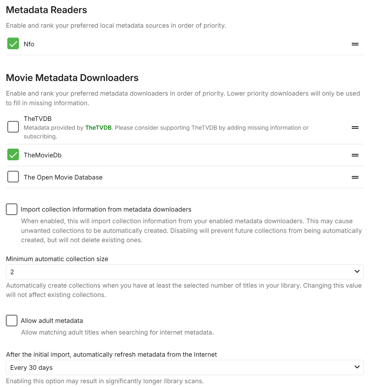 PeteD 3 Posted December 7, 2024 Author Posted December 7, 2024 1 hour ago, ebr said: Hi. If you are going to customize your metadata, I HIGHLY recommend checking that last box to save NFO files. That should ensure that your customizations will be retained. I'll give that a go... Thanks!