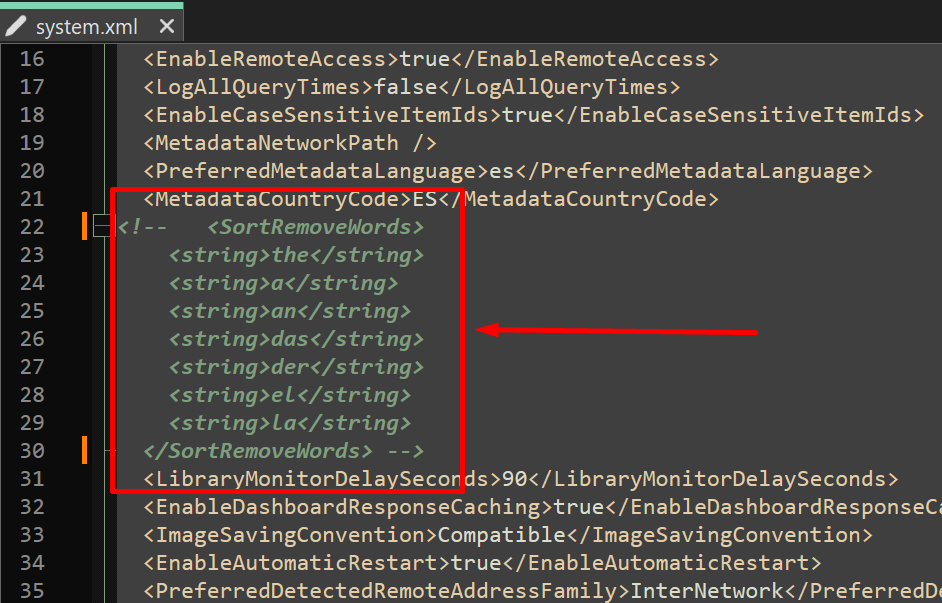 Asazen 8 Posted December 10, 2024 Author Posted December 10, 2024 19 hours ago, Happy2Play said: There is no UI option for these SortRemoveWords they are only found in your system.xml You have to go to since Synology something like Data path: /var/packages/EmbyServer/var/config/system.xml and edit it. <SortRemoveWords> <string>the</string> <string>a</string> <string>an</string> </SortRemoveWords> Or going to Emby API and querying the config and reposting it. Something else that should be exposed in the UI. @Luke Also note changing these value will require your to do a complete REFRESH of all metadata to rewrite the sorttitle field in the database. Hi, is it ok to comment on these lines? Or do I have to delete them? This edited, what happens when I update Emby?
