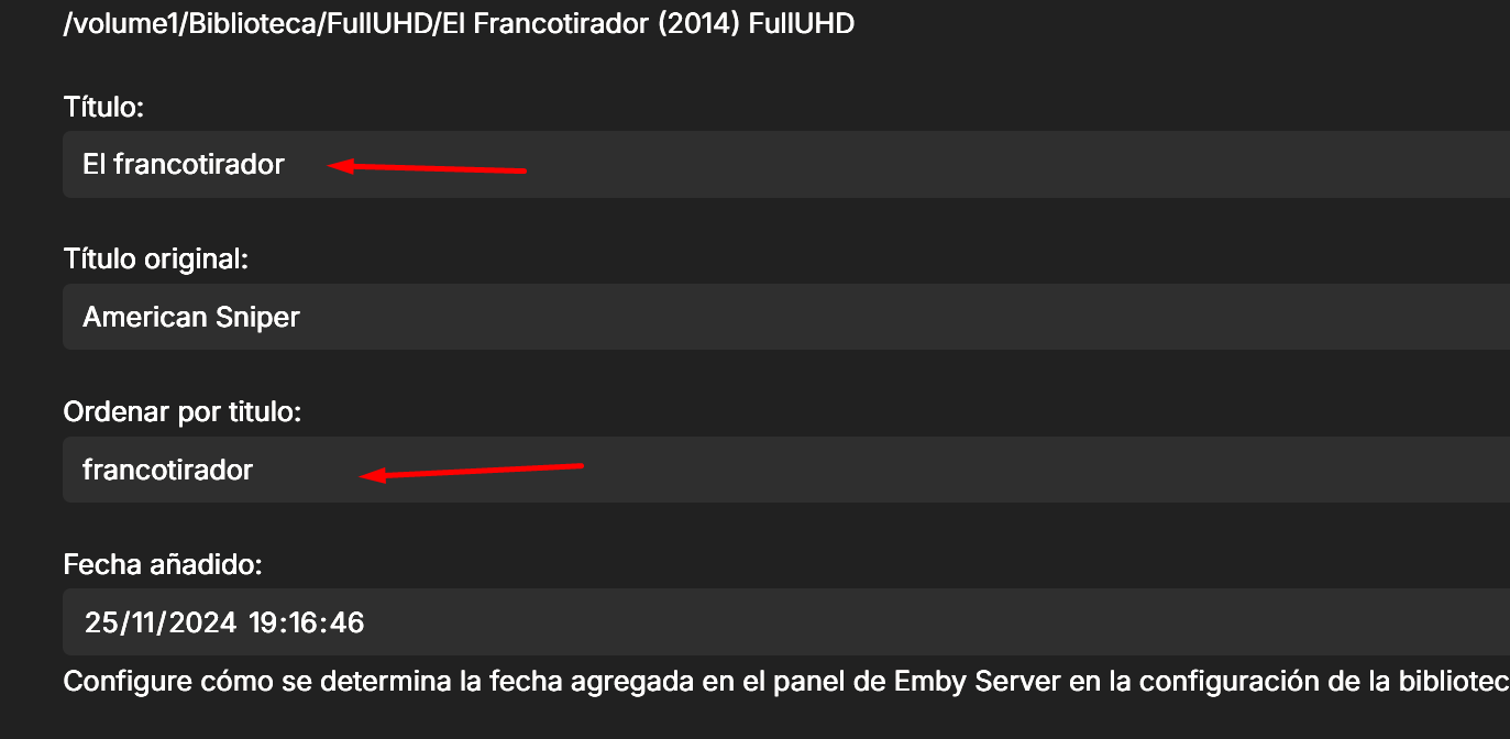 user24 313 Posted December 9, 2024 Posted December 9, 2024 (edited) For your problem movies what does Emby show for Title and Sort Title? Emby automatically removes "The" from Sort Title for English language. Possibly the same automatic removal may be happening for "Los" for Spanish language??? What happens if you manually change your Sort Titles? Also, you need to lock any of the titles if you don't want Emby to change or update them. Edited December 9, 2024 by user24 spelling 1