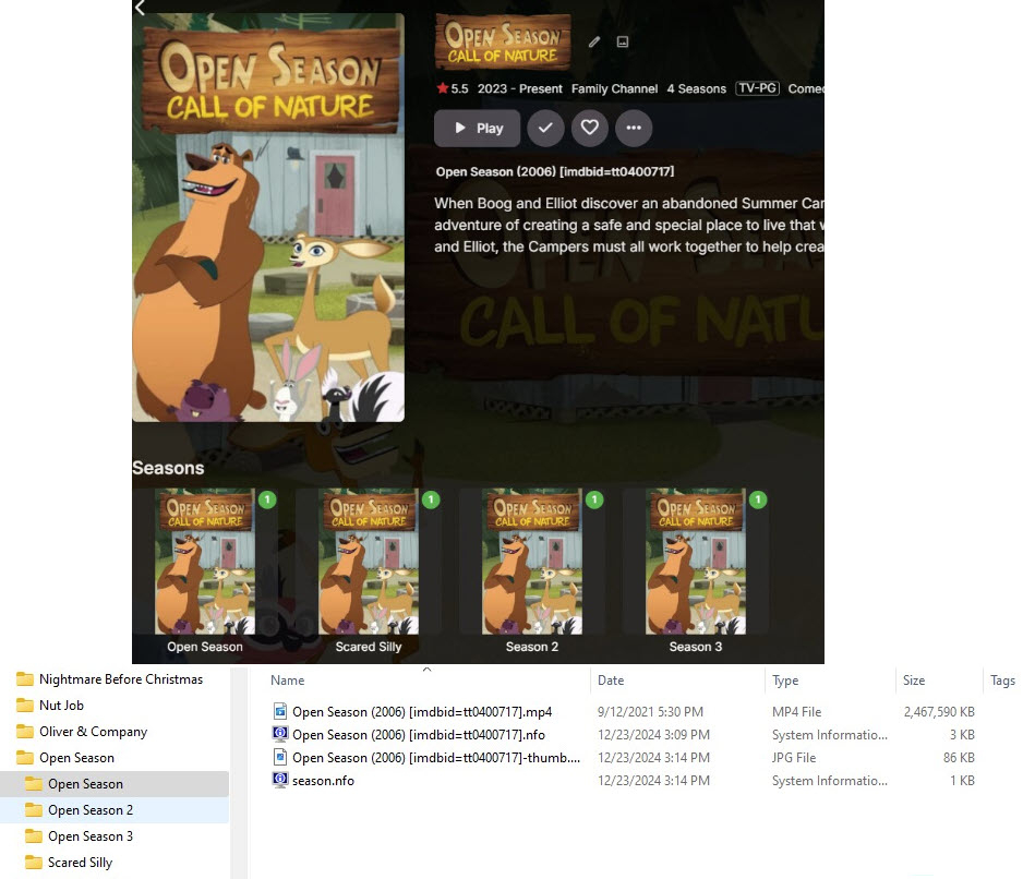 hemsimmons 0 Posted December 23, 2024 Author Posted December 23, 2024 They already had the years in the names. I removed the Open Season folder from the movies folder. Removed all of the .nfo files. Renamed them to incluode the IMDBID in the file name, put them back in the Movies folder, and they are STILL treated as a tv show