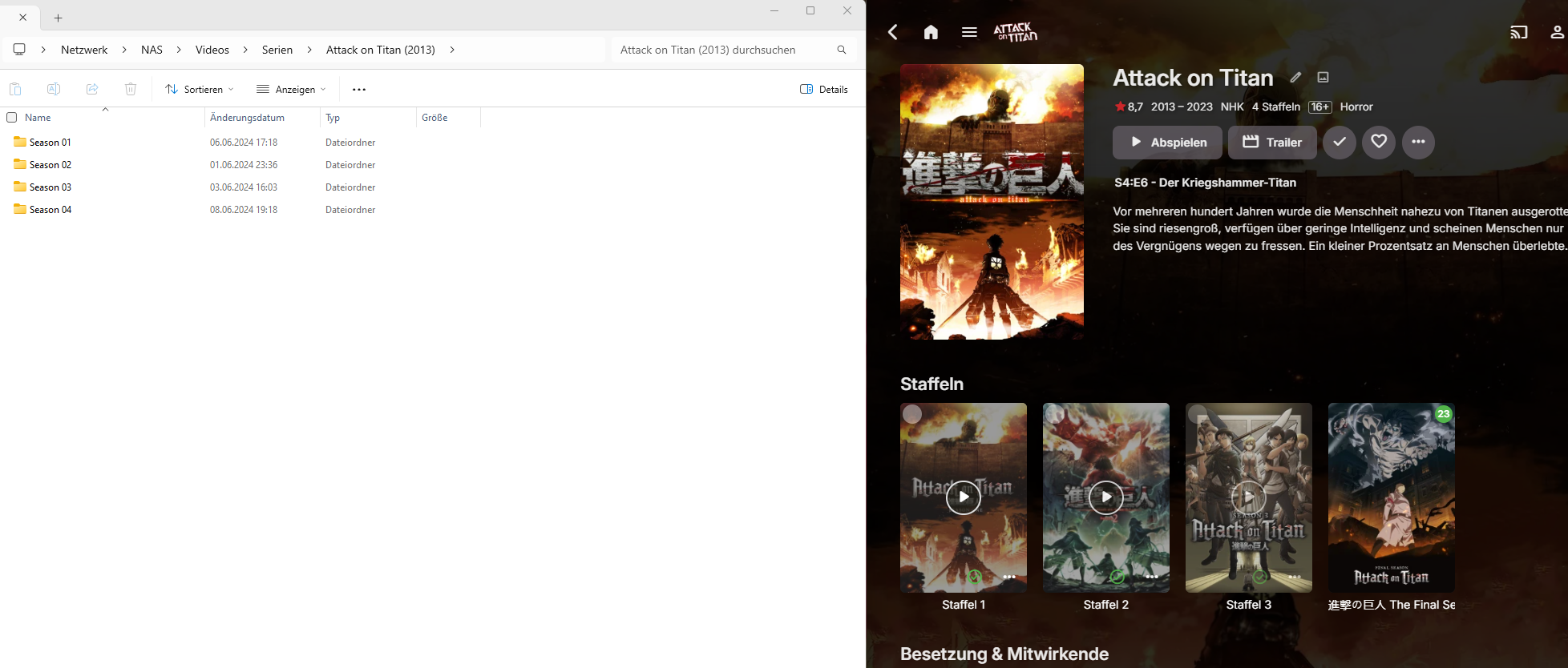updatefreak 11 Posted December 22, 2024 Posted December 22, 2024 Hi, I have a question for the season names. For e.g. the tv show "Attack on titan" I have the season name "Staffel 1", "Staffel 2", "Staffel 3" and "The Final Season" (also with Japanese Signs). So it seams that only the "The Final Season" has a custom/special name. Staffel 1-3 are generic names. Is it possible to disable custom season names in general? -> so for my case that its Staffel 1, Staffel 2, Staffel 3, Staffel 4 (basically that the "The Final Season" is called Staffel 4 I attached a screenshot with the folder structure and the emby overview of this tv show.