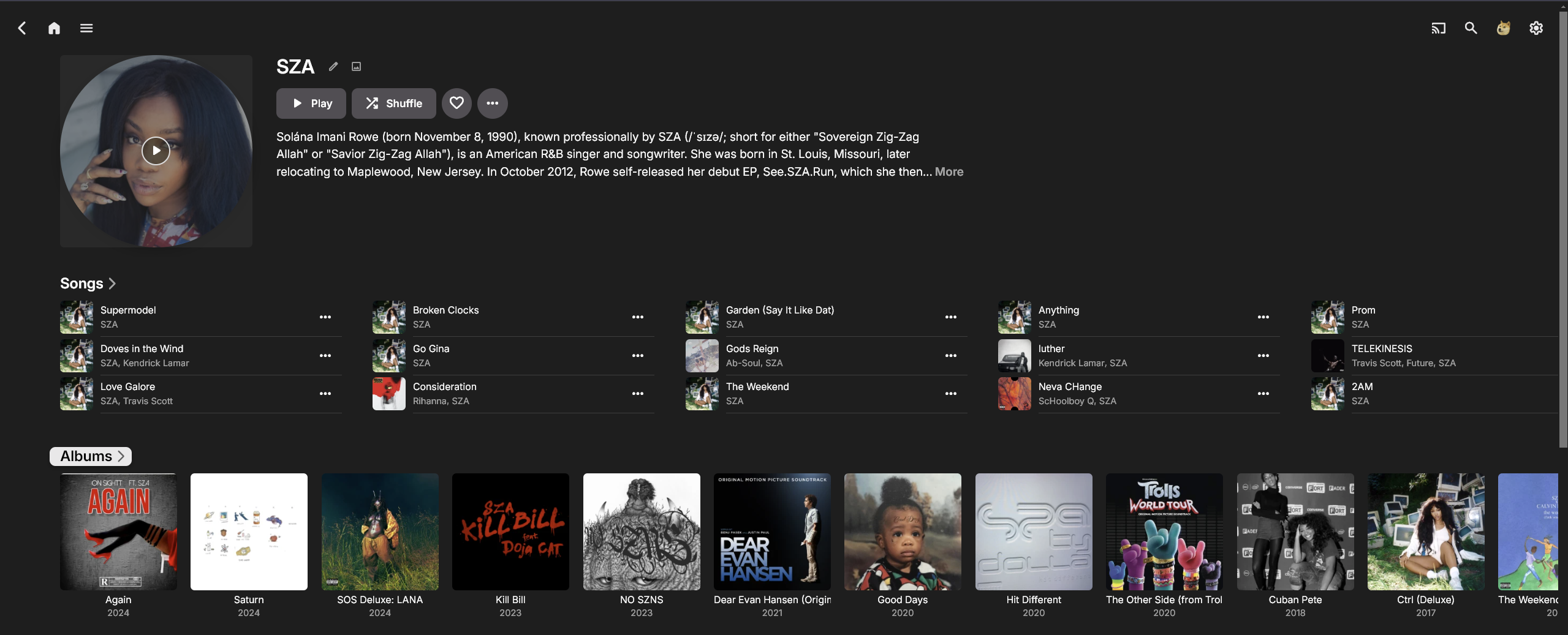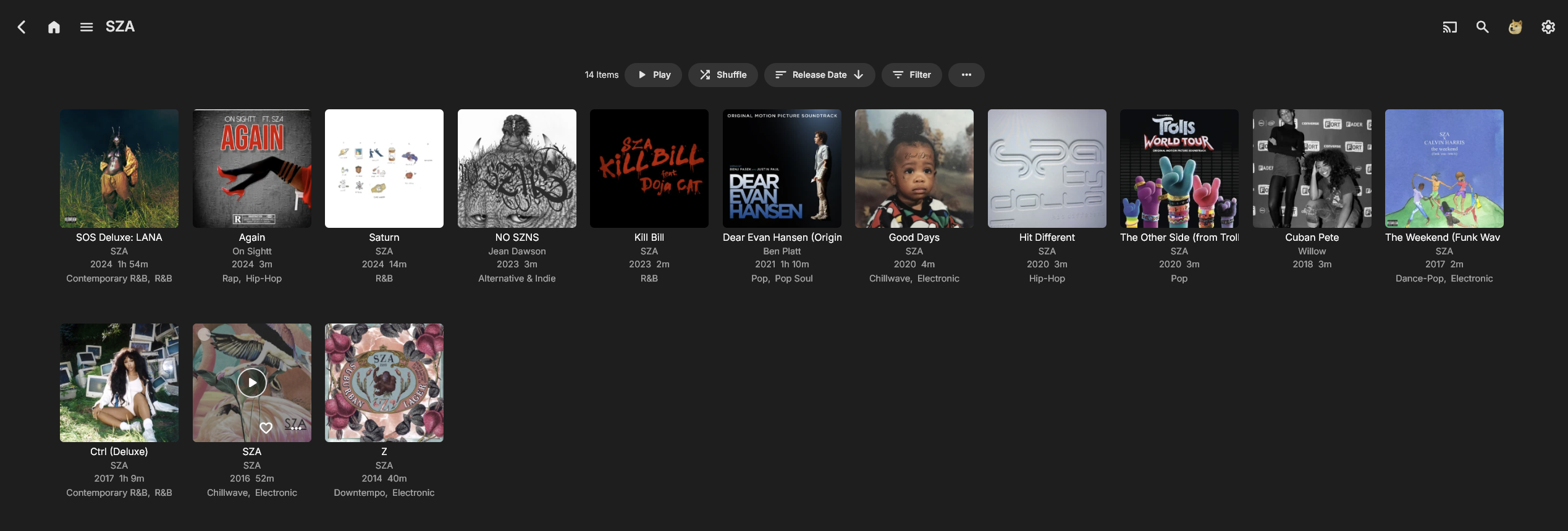 Rumzzz 31 Posted December 23, 2024 Posted December 23, 2024 (edited) Hello, thank you for your continued development on Emby! I do not think this specific feature was requested before. The horizontal album lists do not seem to be including month/day when sorting by release date. This applies to the Artists page (Albums, Appears On), or when viewing a single album (More From, More Like This). Here is the Artist page view with incorrect album release date sorting (specifically, the 3 releases in year 2024): Here is the bottom of the single Album page view with incorrect release date sorting: And here is the album list sorting, which does correctly order by year/month/day: Not sure how big of a change this would be to include the full release date on these horizontal lists, but would make album release date sorting more normalized/consistent. Thank you! Edited December 23, 2024 by rumzieee Additional info