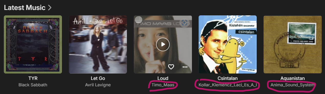 bsapi 14 Posted December 27, 2024 Author Posted December 27, 2024 On 12/25/2024 at 6:41 PM, Luke said: HI, when you specify this as your file and folder layout, if the file is not tagged with the necessary embedded information, then the folder name will be used as the artist name. It needs to be tagged with an albumartist value. Hello and thank you. Well. I usually add all metadata to the music files. Probably you now the mp3tag software. That's what I use. I used to use it. All my music file were edited with this. So I think this part is fine. I did the tagging and uploaded to my share but this time Emby acted differently. First I though it is permission issue. I changed to 777 but it didn't work. I am not sure what I am supposed to do because I haven't edited the files on Emby (level) so far. 1.) Mp3tag 2.) Upload 3.) Refresh library 4.) Done Following screenshot is about you can see older uploads are fine (like Black Sabbath and Avril) but new ones like Timo Maas or Anima Sound System took the folder name literally.
