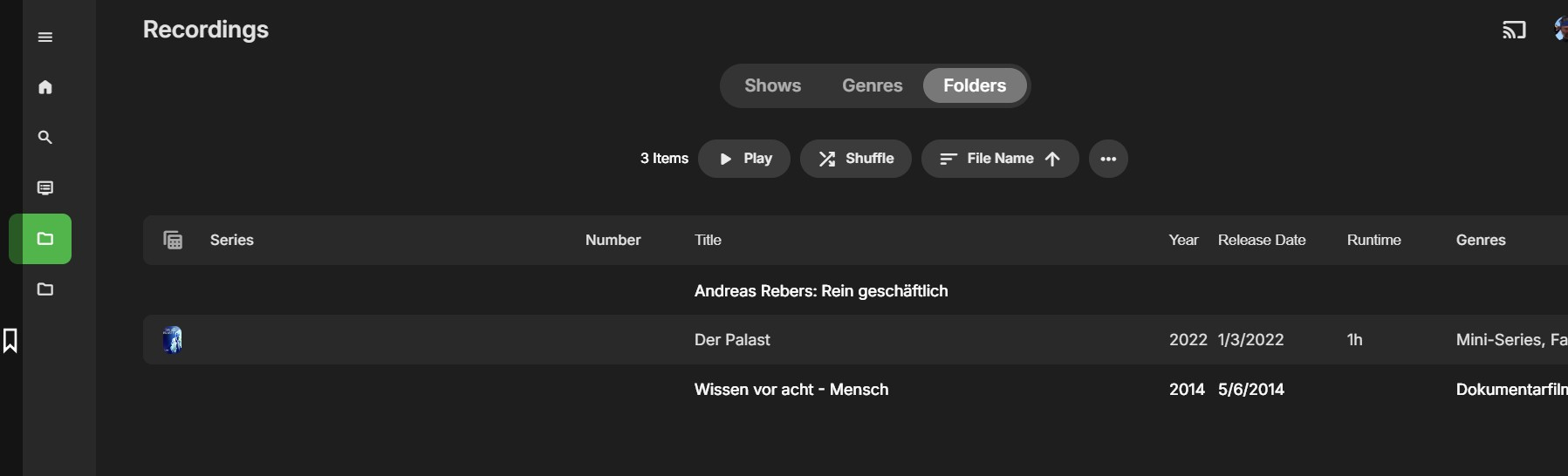 juergenthefish 0 Posted January 3, 2025 Author Posted January 3, 2025 I am not sure if got my point. There are obviously two different entities in the web gui both being called "Recordings". One is the default (see screenshot attached from Live-TV config) and it works perfect for me, i.e. contains all my few recordings. But the other "Recordings" is a miracle to me: When I choose “Live TV” on the left pane and then click on “Recordings” at top of the screen, I am getting a “No items found”". Hence I am wondering what is the difference between those two types of “Recordings”. Do you see my point now? I am also attaching a screenshot from that mircaculous second "Recordings" entity. And to show you that I do have recordings underneath the first mentioned (default) recordings folder I am attaching that third screen shot for you.