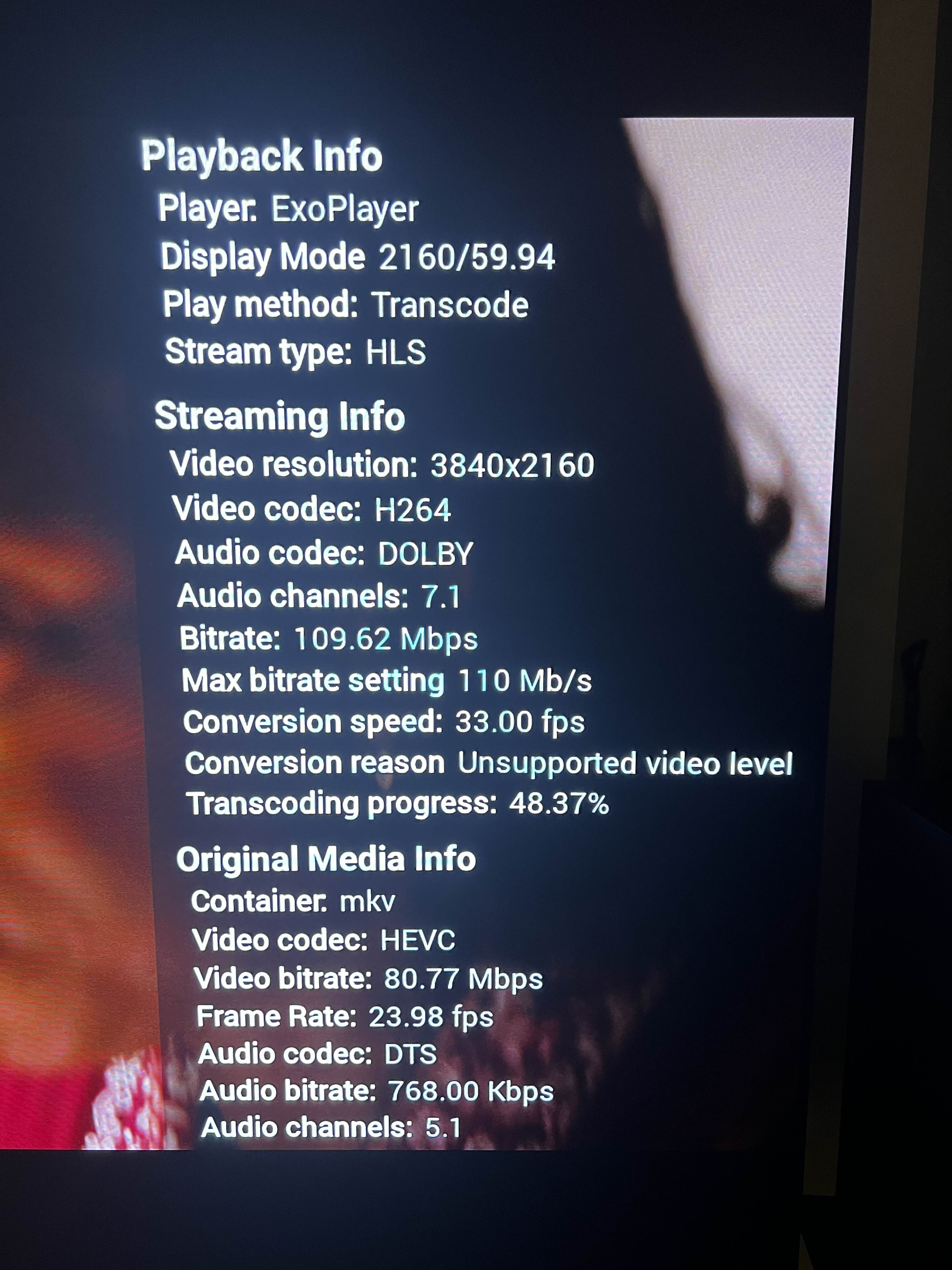 tbutz12 0 Posted January 1, 2025 Posted January 1, 2025 (edited) On my NVIDIA Shield, it is transcoding on Emby instead of direct playing on my LAN. Any reason why or anyone know how I can fix it? ffmpeg-transcode-69e6be42-ffb4-499f-94fc-261a3d22d923_1.txt Edited January 1, 2025 by tbutz12 Fixing images