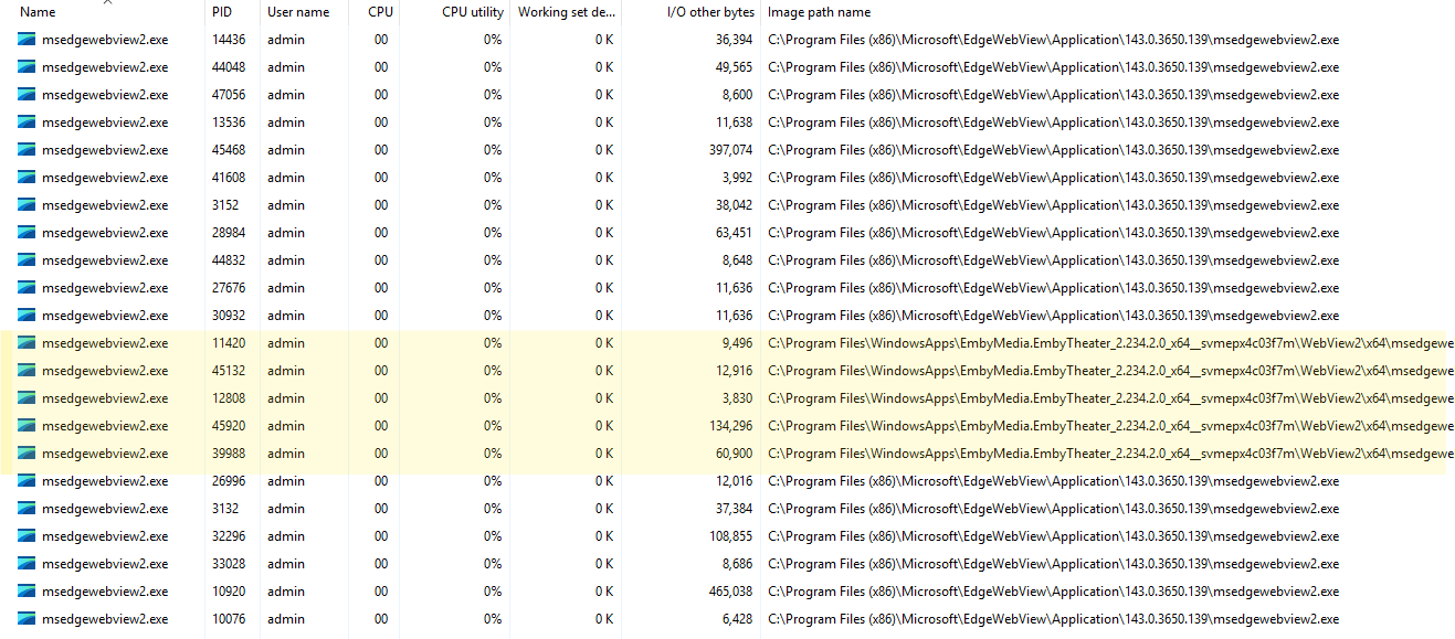 softworkz 5066 Posted January 13 Posted January 13 1 hour ago, nurrburt said: To clear up any confusion, I did read all of the responses and links in this thread, but perhaps I wasn't clear on what I meant by not understanding the technical aspects. What I meant to convey is that I am not a programmer, so while I understand that the delays stem from using webview2 for example, I don't know how much control you have over the process As it is simply about WebView2 taking time to start up, I assumed that even a non-programmer would figure that a component that isn't ready yet, would neither allow to display any ghosted/pseudo content, so I concluded you haven't read the explanations, while - apparently that was a developer's conclusion only. I really don't know why it takes those seconds to start up, even though Electron apps - which are also driven by a Chromium-based HTML engine can start much faster. MS provides two ways for using WebView2: Shared system runtime or shipping one's own runtime. We do the latter (reasons also explained somewhere), but MS' preferred way is for everybody to use the shared runtime - => because: this allows faster app startup => but: How they are doing this? The answer is: they are just leaving the browser processes running when the app is closed and they keep them running forever, even when unused. And the app has no control about this. When you see the task manager screenshot below, you can see the shared runtime processes (white bg) plus our runtime that we include with the app. When you close the Emby app, all the yellow ones are exiting and nothing remains running. Considering what MS are doing here - they have no better solution for their own software than keeping the WebView running - is what's makes me estimate the chances that there would exist any good solution for this as rather low. 1 hour ago, nurrburt said: Quote would have very kindly and patiently lied to you (not necessarily by intention) by responding something like: "Oh, these are all great ideas, thanks a lot for your input, I will share them with the team and we will discuss this internally!" ? That's a fair question and something I think about often - pure honesty vs. white lies. Last year, I had a support case with MS. It was fulfilled by a company in India. Skipping all the sick details that happened, I was arguing with a clueless supporter and been pretty dissatisfied. At the end she said she would promise to forward my complaint to the right department and finally she said: "Yes I'll go upstairs to the developers right now and talk to them". I found out that MS doesn't don't do ANY kind of Azure development in India, and the building of the support firm is all basement, and doesn't even have a 1st floor.-.. 1