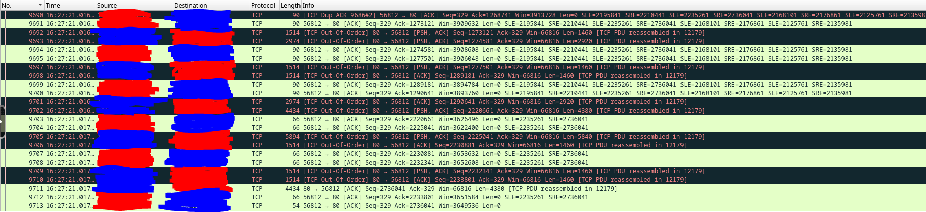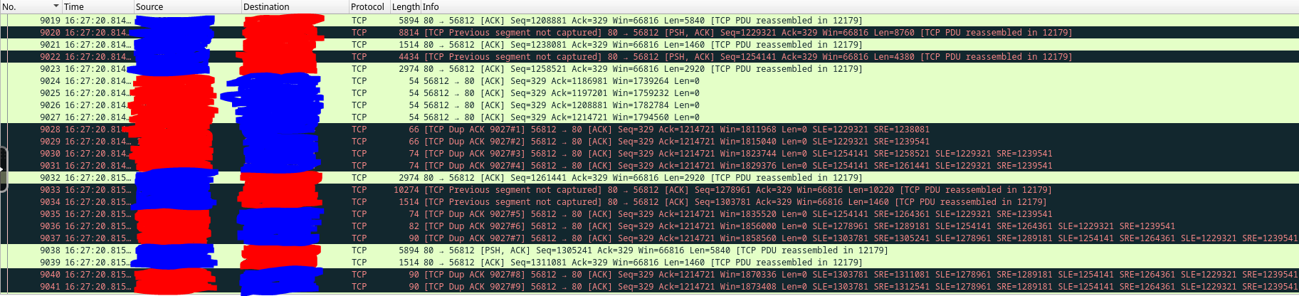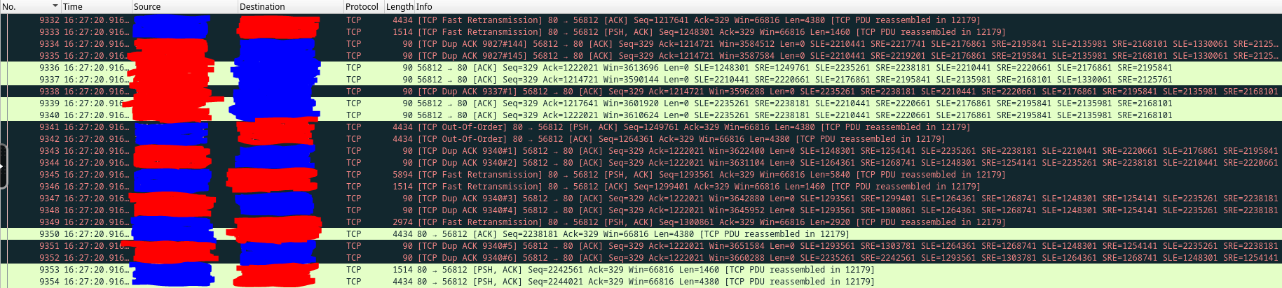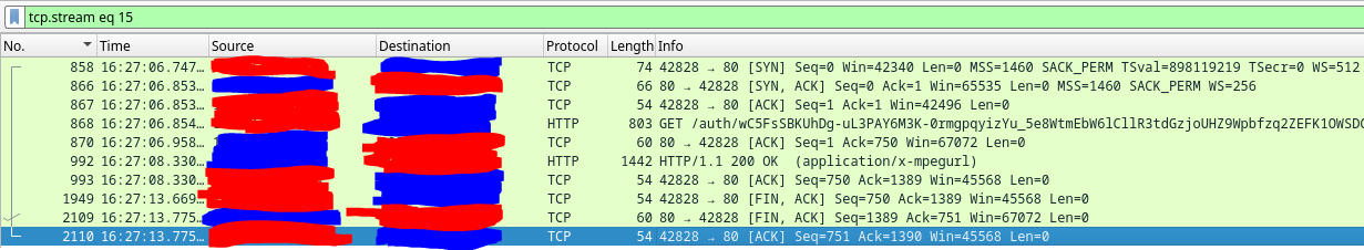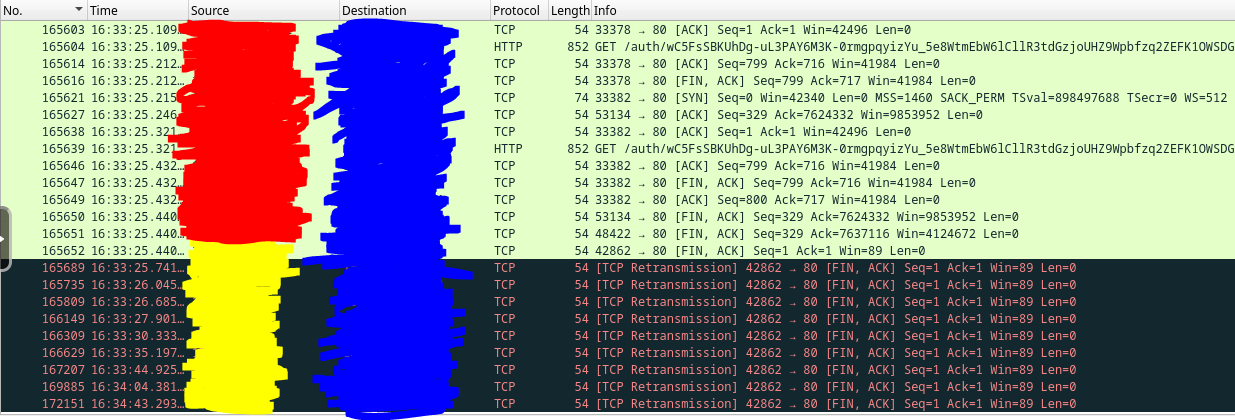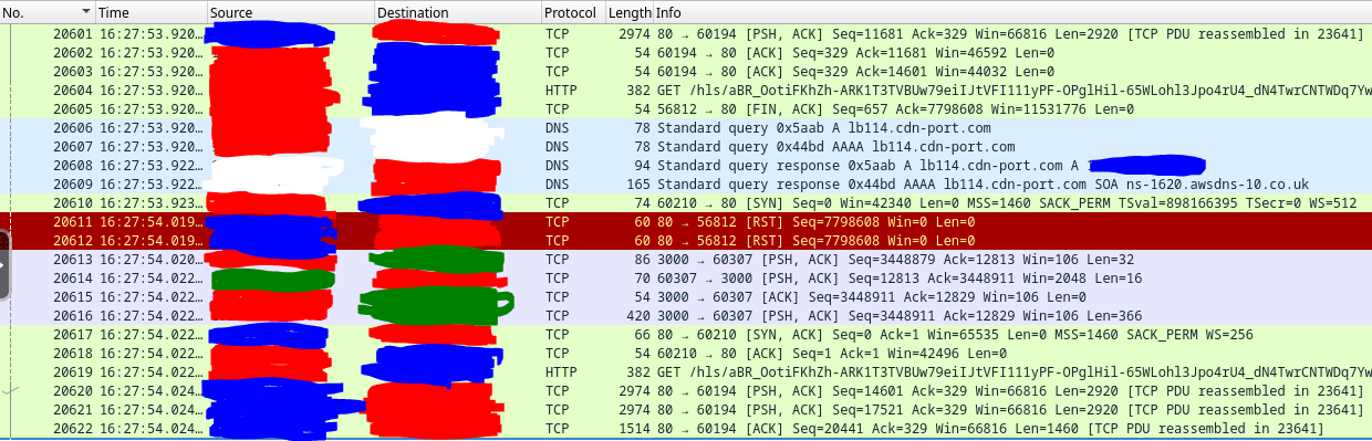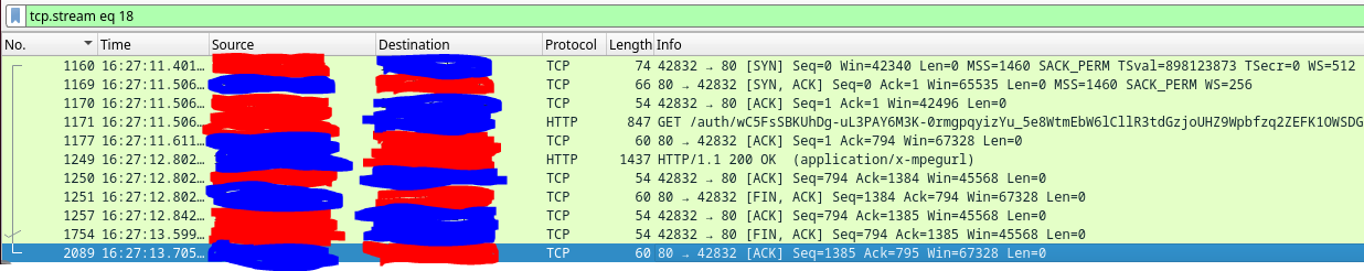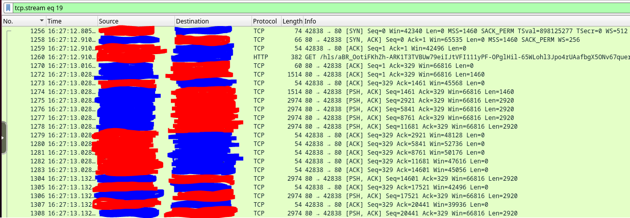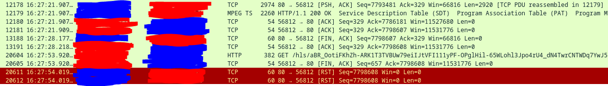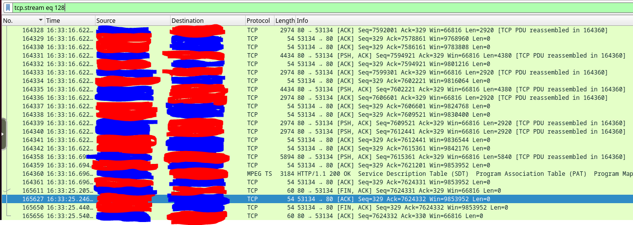 skillsjr123 2 Posted February 24, 2025 Author Posted February 24, 2025 Ok I have a follow-up @Luke. I'm still facing the issues with the Live TV function of my Emby Server. Here's what I've done to try to troubleshoot it thus far: Disabled and enabled hardware acceleration (This didn't appear to have any effect) Turned up the "Constant Rate Factor" of my two encoders (H.264 and H.265) (This didn't improve the freezing, just made the quality look slightly worse) Forwarded port 8920 (8096 was already forwarded) even though my server install doesn't use HTTPS, figured I'd still try it (this didn't fix anything) Edited my router for a couple settings: Disabled my IGMP Proxy (this didn't seem to have any effect) Edited my IGMP Version to force V3 instead of V2 (this didn't seem to have any effect) Enabled QoS and forced my server to be prioritized above everything else (this didn't seem to have any effect) Upgraded my server off of the stable version and onto the latest beta version (I use a docker container for it in Unraid). Upon looking at the logs again, I found that every so often, it needs to open what looks like an auth link, then will open an hls link directly afterwards twice (as seen below): However, at the end of the stream when it freezes I get the auth, but no hls like above: I had noticed this happen almost every time the stream freezes on me, so I installed Wireshark as a docker container and tracked all the traffic on the host. Here's what I saw for the communication between my server and the IPTV provider when I opened the channel to start watching (everything crossed out in blue is my IPTV provider and the red is my server LAN IP): Here are some tcp.streams from the above graphic: tcp.stream 15: tcp.stream 18: tcp.stream 19: Here is what I can see later on down the line just before the Live TV fully connects and starts playing: This looking at a single TCP stream at the beginning of the stream: I see that very often there are large chunks of duplicate packets that get sent between my host and the IPTV provider: The Dup ACKs move all the way up to 145, and then reset themselves again: It will also report multiple streaks of packets being received by my host Out-Of-Order every so often as shown below: Here is what it looks like at the end of that TCP stream: Here is what that traffic looks like outside of that TCP stream (Green is my TV that I was watching it on and White is my router): This is what it looks like at the end of the stream when it freezes (Yellow is the Docker Container IP): The following are some notable TCP streams from the above image: tcp.stream 128: tcp.stream 129: tcp.stream 130: tcp.stream 131: Basically the way I'm seeing it is that tcp.stream 128 persists while tcp.stream 129 and 130 try to reauthenticate. However, they obviously don't and then we are left with tcp.stream 131 which is where the stream freezes. I'm unsure at this point as to what exactly is causing this issue. It could be the provider, but it could also be something within Emby that can't find the site after a certain amount of time and the auth never gets finalized. The strange thing is that sometimes it will go 5 minutes before a freeze and sometimes it will go 4 hours without a freeze. Here's my full workflow as of now: I have Emby Premium with a Lifetime Subscription. I use it for IPTV mostly. I have two IPTV links that come in from the same provider and get combined into IPTVBoss (with Emby Support) to help me with the EPG integration. It then exports the M3U and XmlTV links to Dropbox. I use those two links as the TV and Guide Data Sources for Emby. Based off of all the info I have within this post, what are your thoughts as to the cause of my freezing. I've waited very patiently for almost 1.5 months since my original post, but both myself and my users are getting very frustrated at the freezing that occurs. At this point, do you think it is your application (Emby), IPTVBoss, Dropbox, or my IPTV provider that is causing this issue? Please let me know when you can. Thanks.