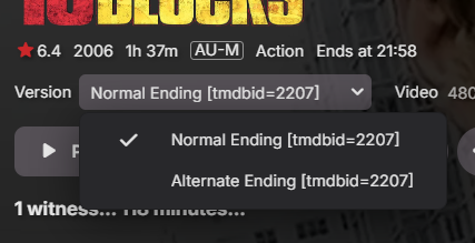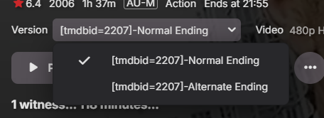 Fweep 11 Posted July 2, 2025 Posted July 2, 2025 Sorry to necro this after 6 months, but it wasn't marked as solved, and I'm having the same issue. I think there's a bug. First, though, to the OP, @daleala: according to the docs, versions are supposed to have a space on each side of the dash, like the following: 16 Blocks (2006) - Alternate Ending.mp4 16 Blocks (2006) - Normal Ending.mp4 However, getting that nuance of the syntax perfect doesn't really change anything for us. The versions are still only merged as long as the folder name is "16 Blocks (2006)". If the folder name is instead "16 Blocks (2006) [tmdbid=2207]", then they do not merge, and there doesn't seem to be any way to make them merge. This is unexpected behavior which should be treated by the developers as a bug, in my opinion. (I'd include a screenshot for my actual example, but it would just be the same as your 2nd post.) Yes, @adminExitium, it is true that the docs imply that the file name has to exactly match the folder name, but I am pretty sure this was not meant to include the metadata provider tags. Normally you would never have to put the tags in the file names. For example, if the folder name is "16 Blocks (2006) [tmdbid=2207]", you are not actually expected to change the file names to "16 Blocks (2006) [tmdbid=2207].mp4", nor something like "16 Blocks (2006) [tmdbid=2207] - Alternate Ending.mp4". —At least I hope not, because not only is it ugly, but it also doesn't work to solve our problem; the mere presence of the ID in the folder name prevents the merge of the versions, even if we include the ID in the file names. Strangely, I am able to get merging with a provider-tagged folder to work for a TV show. I think it is because episode numbers help determine the match. For example, I have this folder structure, and the two versions of the pilot episode get merged as expected: \Seinfeld (1989) {tvdb=79169}\Season 1\S01E01 \Seinfeld (1989) {tvdb=79169}\Season 1\S01E01\behind the scenes \Seinfeld (1989) {tvdb=79169}\Season 1\S01E01\behind the scenes\The Seinfeld Chronicles - Inside Look.mkv \Seinfeld (1989) {tvdb=79169}\Season 1\S01E01\Seinfeld S01E01 Pilot - Good News Bad News (Syndication Pilot).mkv \Seinfeld (1989) {tvdb=79169}\Season 1\S01E01\Seinfeld S01E01 Pilot - The Seinfeld Chronicles (Original Pilot).mkv