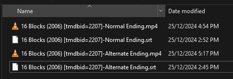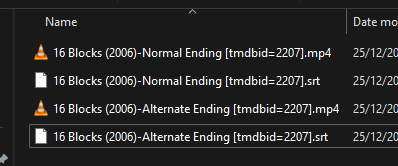 daleala 0 Posted January 6, 2025 Author Posted January 6, 2025 50 minutes ago, adminExitium said: If each movie & all its versions are in a single separate folder, then you can add the ID tag to the folder itself rather than the individual files. Thanks for the suggestion! I tried that, and it's now added the movie in twice into Emby. I've tried with a space between the year and the tmdib tag, and without a space, and neither work. Can you check if I have labelled them correctly please? There's nothing else in the folder, just those 4 files. If I remove the tmdbib tag from the folder and rescan the library, it puts them back into just one movie (with both the normal and alternate ending versions selectable).