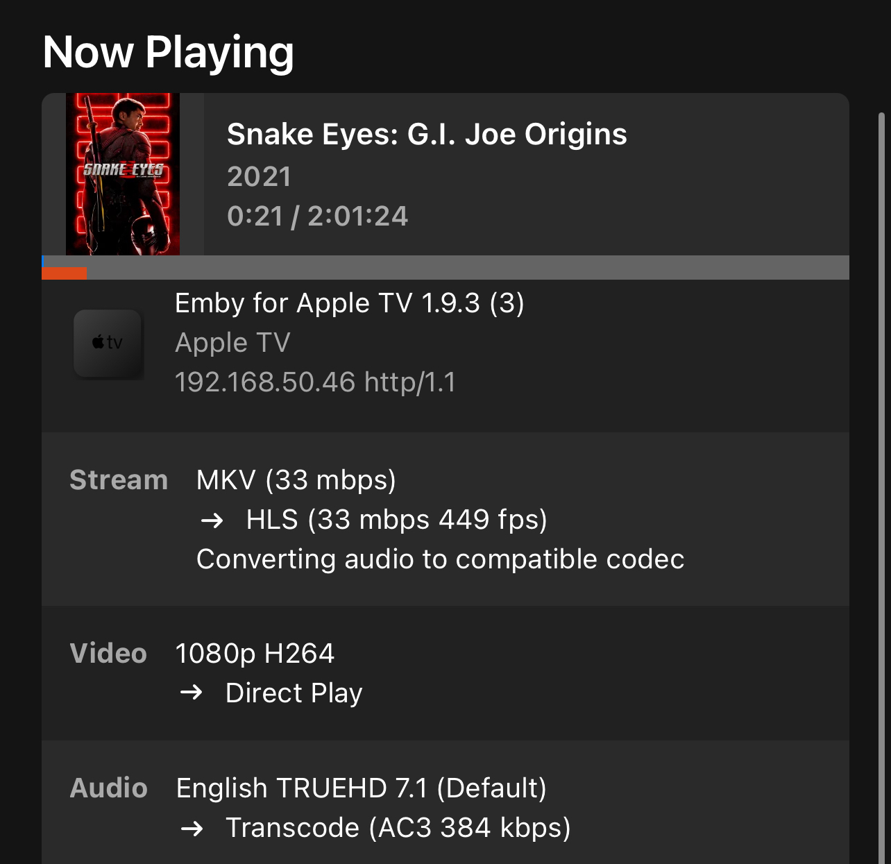 Bash103 6 Posted November 11, 2025 Author Posted November 11, 2025 (edited) If they are both doing the same thing why is there such vast difference in sound quality? Also, why does the above screenshot show Emby is transcoding the audio to AC3 instead of LPCM? Edited November 11, 2025 by Bash103