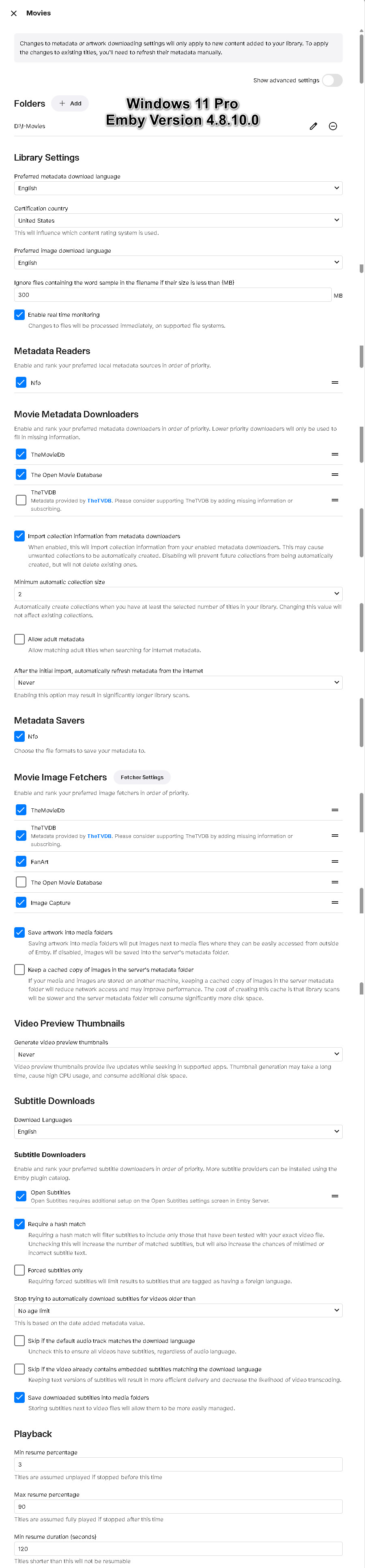 : These are my settings in the Movies library. I didn't include any log files because I wasn't sure WHICH of them might help and didn't think that something like issue would be logged anyway?