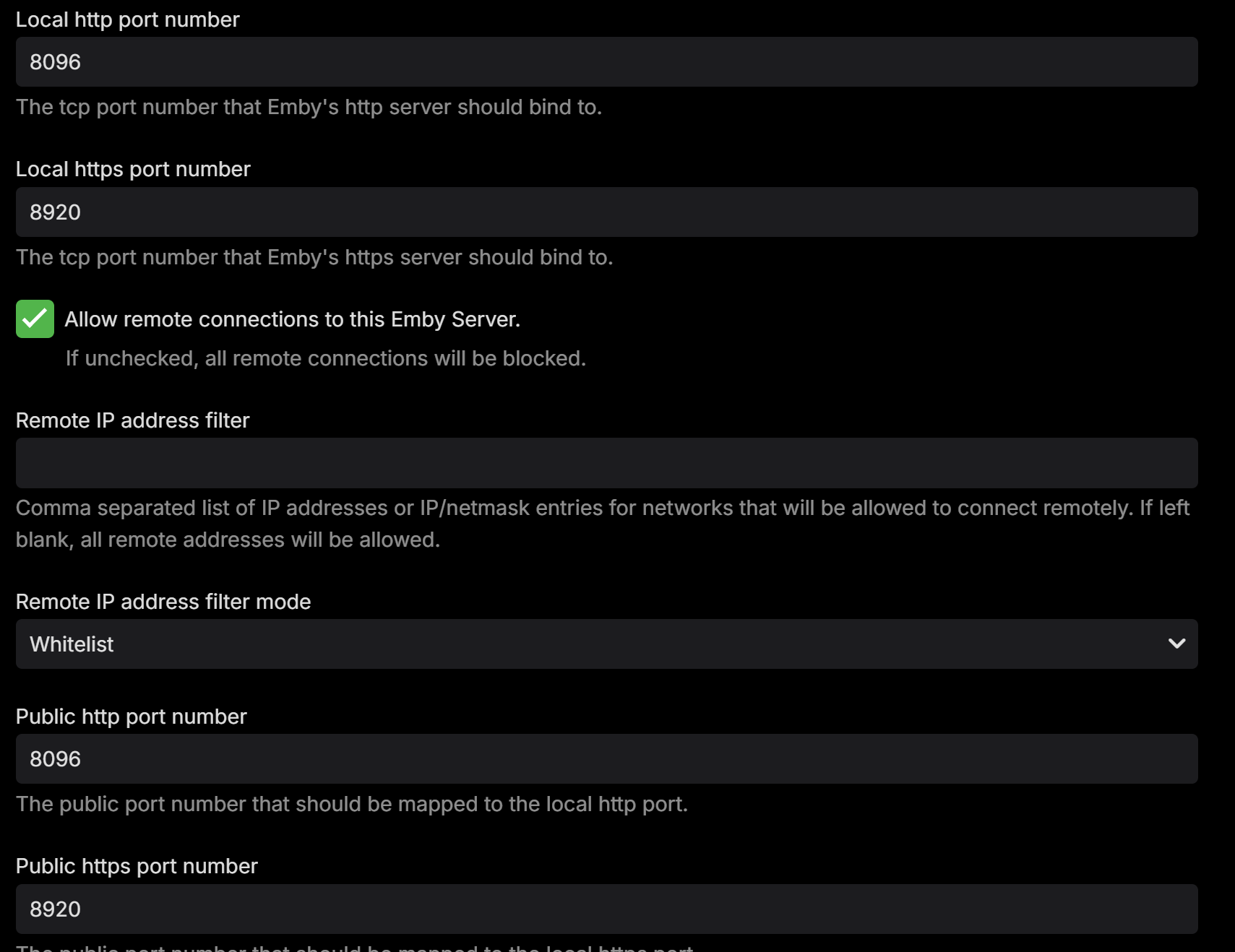 Solution Happy2Play 9780 Posted January 28, 2025 Solution Posted January 28, 2025 29 minutes ago, AndreiP said: Please confirm or correct my understanding of the configuration. Yes that is correct. 30 minutes ago, AndreiP said: P.S. Also, btw, could you please explain to me why there are 2 ports (8096 and 8920) that are open and not just one currently. I thought that Emby force always to use an insecure connection... Depends on your setup if you are providing a ssl cert or not so in reality you only need to forward the method you will be using. 1
