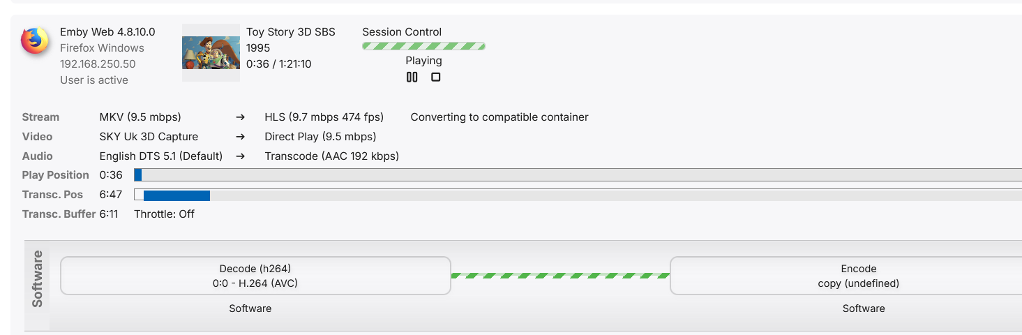 Airbender 128 Posted February 5, 2025 Author Posted February 5, 2025 Hello @RanmaCanadaNice nick name one of my favorite cartoons ever. Thank you for taking the time to write the post and include a screenshot. Regarding your question about transcoding, how did you achieve that? Is it a built-in feature of Firefox that I may not be aware of? Regarding your response, why would you assume that I don’t have a 3D TV? If a user has 1.5TB worth of 3D movies, wouldn’t it be logical to assume they own a 3D TV? That wouldn’t make much sense otherwise, would it? I have two different models of 3D TVs, which is why I'm trying to get 3D to work properly. I've been testing different setups and came here for further assistance. I stated from start in my post if someone read it properly MY PC IS 13 YEARS OLD. sorry for the caps, so i am aware of it shortcoming but i do believe there must be a setting that i can set up and mybe get this working until i have MONEY to buy new hardware. it is all comes down to $$$. that why i am using 13 years old hardware currently. Regarding the comments about user access and limiting users to a lower bitrate—I have no idea where that setting is. I looked around but couldn’t find it. That’s the default Emby setting; I haven’t touched it. Everyone keeps saying, "3D movies won't play properly if your hardware doesn't support it." I understand that, but currently, none of my client devices are encoding. Please refer to my earlier test on a PC with an AMD Radeon RX 6600 GPU. Are you saying that the AMD Radeon RX 6600 on a Windows PC isn't capable of playing 3D movies? I don’t think that’s correct. In fact, Emby Server is handling the heavy lifting, so I’m not sure why the Radeon RX 6600 wouldn’t encode. I’m trying to figure that out. I Tested it with AMD Radeon RX 6600 and Tested it with Xbox X which is far more powerful the RX 6600. regardless we all know my media center pc is old and it does not have CPU or GPU for transcoding therefore it is buffering. I took the liberty of conducting further tests using a different system I borrowed from a friend. I installed both Emby Server and Plex Server for testing, and as I suspected, Emby still buffers while Plex does not. i was able to play with encoding setting and bring cpu usage down but buffering did not get fix. Here is a new system, this is bit older pc as well but for this test it should be good CPU Intel Core i7 4790 @ 3.60GHz RAM 16.0GB Dual-Channel DDR3 @ 798MHz (11-11-11-28) Motherboard LENOVO SHARKBAY (SOCKET 0) Graphics Intel Arc A380 ELF Graphics (Unknown) Storage 465GB Samsung SSD 860 EVO 500GB (SATA (SSD) Here are the logs and screenshots for everyone review. embyserver.txt embyserver-63874303735.txt ffmpeg-transcode-29f1be26-275e-46c1-bff3-af091c0deddd_1.txt ffmpeg-transcode-351c12e1-a57b-4b15-b120-206c7354195e_1.txt ffmpeg-transcode-805e0544-621e-4388-add6-08eb1182da6e_1.txt ffmpeg-transcode-93468897-e436-4681-a324-9e20b98d2555_1.txt ffmpeg-transcode-b1bf7732-2dc7-44bf-995c-d86188ab3306_1.txt ffmpeg-transcode-d6b6e34c-a97f-414a-90f1-a1c4f65515f0_1.txt hardware_detection-63874303808.txt