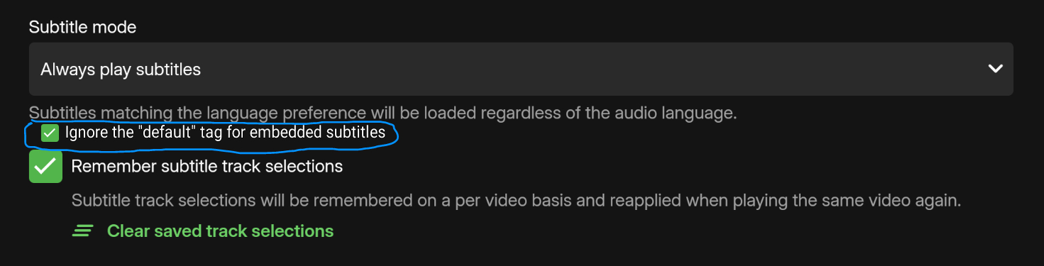 visproduction 315 Posted February 21, 2025 Posted February 21, 2025 If an embedded subtitle is set as default inside the mkv encoded media, it may automatically override external subtitles, no matter what you do. I have not tested this. Have a look at the RFC for mkv and perhaps test to see if this can be true. If so, you may have to remove the subs or turn the default switch off in the media because, by design, the internal subtitles may be set to override external subtitles. This may only happen if the default flag is set as active. Maybe that explains why only sometimes this comes up as an issue. see: https://www.ietf.org/rfc/rfc9559.html#default-track-selection Quote 5.1.4.1.5. FlagDefault Element \Segment\Tracks\TrackEntry\FlagDefault definition: Set to 1 if the track (audio, video, or subtitles) is eligible for automatic selection by the player; see Section 19 for more details.