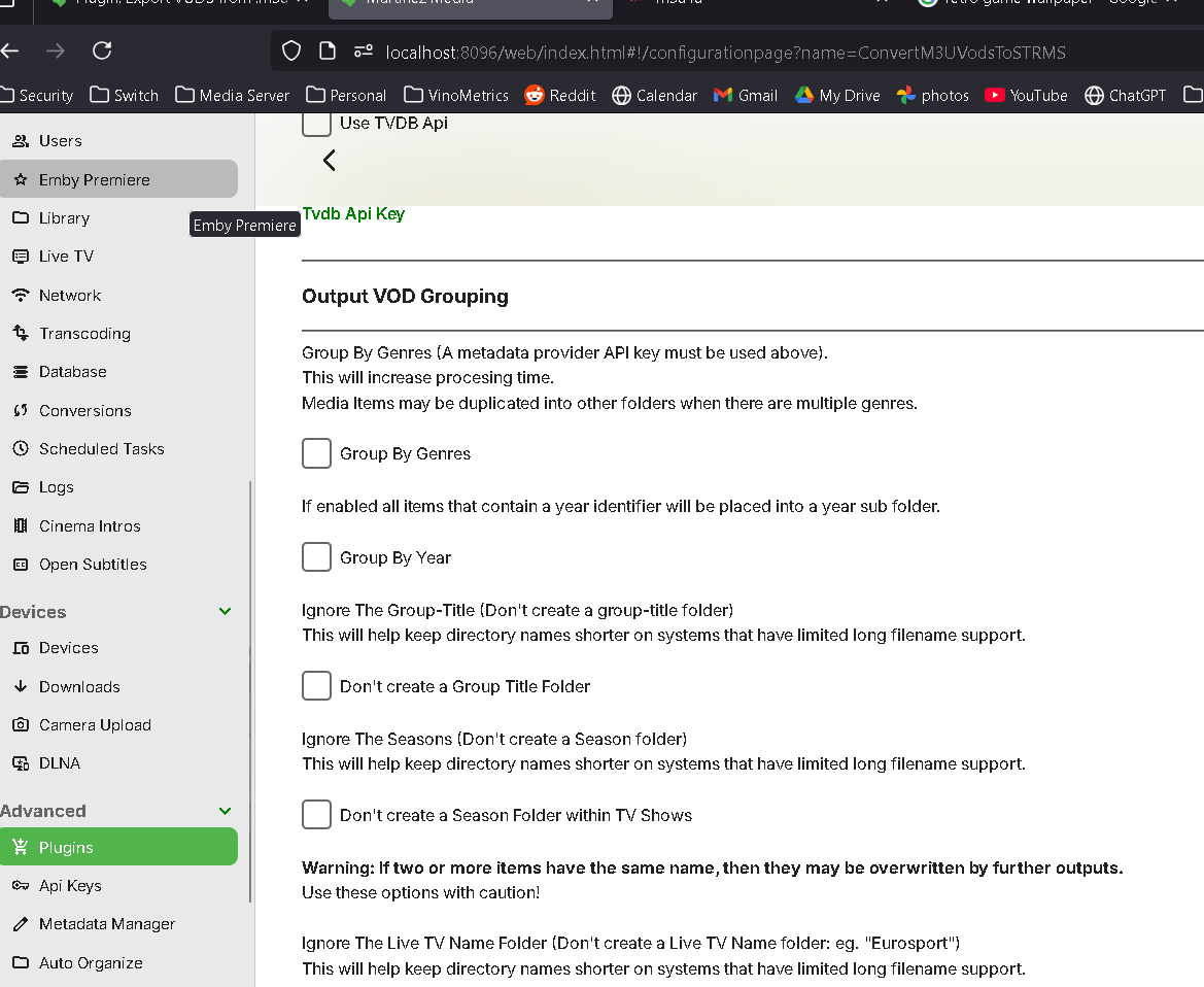 BigIrn 10 Posted May 4, 2025 Posted May 4, 2025 (edited) On 5/1/2025 at 4:56 PM, mickle026 said: OK, I think all your requests are now complete @goin3d Now an option whether or not to re-write files that differ, there is not a huge lot I can do here. I have created a test for files that exist, if they do it wont overwrite them, but what is left is these duplicate entries that have a different url. You choose either to update urls or not. This will affect if anything else is updated to a new url location. So now if the output file already exists you can choose by unchecking the box, not to write the second file with a different url over it, this will affect any other urls that have changed. 01.May.2025 - 14:38:41 Debugging: [scanM3UFileAsync] m3uContents Contains: 26 Items. 01.May.2025 - 14:38:41 -----------------------[ Updating Output Folder ]------------------------------- 01.May.2025 - 14:38:41 Debugging: Setting Filesystem Update to 12 of 16 cores/threads to prevent system freeze. 01.May.2025 - 14:38:41 Debugging: Remove Obsolete Files: True. 01.May.2025 - 14:38:41 Debugging: Files to check: 15. 01.May.2025 - 14:38:41 Debugging: Remove Obsolete Files - Progress: 7.69%, Memory used: 26 MB. 01.May.2025 - 14:38:41 Debugging: Remove Obsolete Files - Progress: 46.15%, Memory used: 26 MB. 01.May.2025 - 14:38:41 Starting FileRemover: 0 Items to delete. 01.May.2025 - 14:38:41 Checking for folder deletion Tasks. 01.May.2025 - 14:38:41 Skipped root folder: D:\VODS\goig3d-test.m3u (contains .strm files or subfolders containing them). 01.May.2025 - 14:38:41 All delete tasks completed. 01.May.2025 - 14:38:41 All Updating tasks completed. 01.May.2025 - 14:38:41 Debugging: Item(s) count: 1 01.May.2025 - 14:38:41 Debugging: StrmsToWriteBag.Count=1 01.May.2025 - 14:38:41 Starting File Writer: 1 Items to write/update. 01.May.2025 - 14:38:41 Item [1] Already Exists! - I/O Queued for Overwwriting [TV Shows]: D:\VODS\goig3d-test.m3u\TV Shows\Mystery\Big Mouth\Season 01\Big_Mouth_S01_E08.strm 01.May.2025 - 14:38:41 Debugging: Fetch Images: False. 01.May.2025 - 14:38:41 Finished this import. 01.May.2025 - 14:38:41 Task Ended at: 01/05/2025 14:38:41 01.May.2025 - 14:38:41 Task Duration: 00:00:01.93 @BigIrn Finally found a place to put the string manipulations after ignore/includes so they behave as before adding underscores etc. The extra manipulations here were added when trying to find out what was causing re-writes so not much thought was given to where it should happen, but it seems ok now. Please test away VODtoSTRMscheduledTask.dll 905.5 kB · 5 downloads Womp womp... still in genres. embyserver(8).txt ScheduledTask-[M3UToStrm]03.May.2025 - 10.41.08.txt Edited May 4, 2025 by GrimReaper Attachment removed