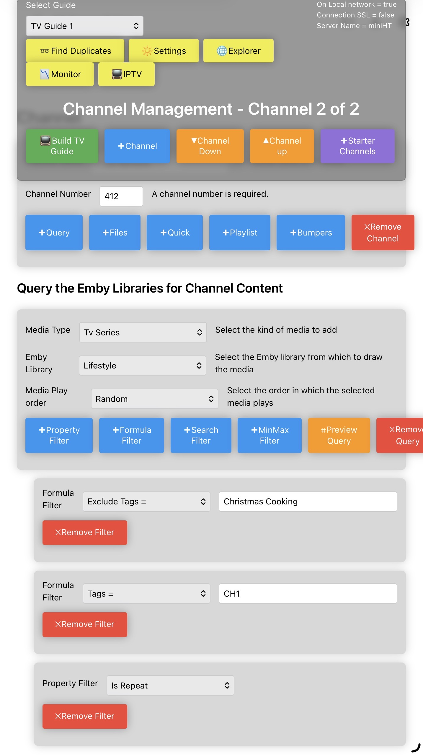 hstamas 179 Posted October 20, 2025 Posted October 20, 2025 (edited) One more and I’ll stop Does the attached look valid? When I crest this channel, it’s not excluding the “Christmas Cooking” tagged episodes? Also when you preview the query, it show the list of shows but I thought you could click on a sheet and view the episodes? Update. I think I answered my own question here. Tag filtering seems to only be taking series tags into account not individual episodes? Is there anyway to create a channel filtering out episodes that have specific tags? Edited October 20, 2025 by hstamas