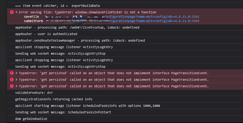 roormonger 6 Posted April 23, 2025 Posted April 23, 2025 (edited) 54 minutes ago, roormonger said: So it seems something is wrong. The epg is not being populated. I can make channels fine but when it comes to sending to the epg, it just ends up empty. I have even deleted the tuner and started with just one channel. In the dev console in the browser I get errors when I try to export the epg or submit it to emby. I named the pictures accordingly. TypeError: 'get persisted' called on an object that does not implement interface PageTransitionEvent. content.js:9:1280 Pt moz-extension://a68a4354-b965-44e5-a870-3489fceb0112/content.js:9 t moz-extension://a68a4354-b965-44e5-a870-3489fceb0112/content.js:10 <anonymous> moz-extension://a68a4354-b965-44e5-a870-3489fceb0112/content.js:40 onNewViewDisplayed https://my.domain/web/modules/viewmanager/viewmanager.js?v=4.8.11.0:1 onViewChange https://my.domain/web/modules/viewmanager/viewmanager.js?v=4.8.11.0:1 (Async: promise callback) onViewChange https://my.domain/web/modules/viewmanager/viewmanager.js?v=4.8.11.0:1 loadView https://my.domain/web/modules/viewmanager/viewmanager.js?v=4.8.11.0:1 (Async: promise callback) loadView https://my.domain/web/modules/viewmanager/viewmanager.js?v=4.8.11.0:1 (Async: promise callback) loadView https://my.domain/web/modules/viewmanager/viewmanager.js?v=4.8.11.0:1 loadContentUrl https://my.domain/web/modules/approuter.js?v=4.8.11.0:1 loadContentUrl https://my.domain/web/modules/approuter.js?v=4.8.11.0:1 (Async: promise callback) loadContentUrl https://my.domain/web/modules/approuter.js?v=4.8.11.0:1 initRoute https://my.domain/web/modules/approuter.js?v=4.8.11.0:1 (Async: promise callback) initRoute https://my.domain/web/modules/approuter.js?v=4.8.11.0:1 handleRoute https://my.domain/web/modules/approuter.js?v=4.8.11.0:1 (Async: promise callback) handleRoute https://my.domain/web/modules/approuter.js?v=4.8.11.0:1 handleRoute https://my.domain/web/modules/approuter.js?v=4.8.11.0:1 (Async: promise callback) handleRoute https://my.domain/web/modules/approuter.js?v=4.8.11.0:1 dispatch https://my.domain/web/modules/pagejs/page.js?v=4.8.11.0:1 show https://my.domain/web/modules/pagejs/page.js?v=4.8.11.0:1 show https://my.domain/web/modules/approuter.js?v=4.8.11.0:1 submitForm https://my.domain/web/configurationpage?name=mytvconfigjs&v=4.8.11.0:3356 (Async: promise callback) submitForm https://my.domain/web/configurationpage?name=mytvconfigjs&v=4.8.11.0:3349 AsyncFunctionNext self-hosted:800 (Async: async) submitForm https://my.domain/web/configurationpage?name=mytvconfigjs&v=4.8.11.0:3128 eventCallback https://my.domain/web/configurationpage?name=mytvconfigjs&v=4.8.11.0:789 itemEventCatcher https://my.domain/web/configurationpage?name=mytvappsjs&v=4.8.11.0:1064 catchClickEvent https://my.domain/web/configurationpage?name=mytvconfigjs&v=4.8.11.0:245 (Async: EventListener.handleEvent) restoreChannels https://my.domain/web/configurationpage?name=mytvconfigjs&v=4.8.11.0:333 start https://my.domain/web/configurationpage?name=mytvconfigjs&v=4.8.11.0:255 callback https://my.domain/web/configurationpage?name=mytvconfigjs&v=4.8.11.0:2577 queryItems https://my.domain/web/configurationpage?name=mytvconfigjs&v=4.8.11.0:2474 queryItems https://my.domain/web/configurationpage?name=mytvconfigjs&v=4.8.11.0:2497 AsyncFunctionNext self-hosted:800 (Async: async) queryItems https://my.domain/web/configurationpage?name=mytvconfigjs&v=4.8.11.0:2497 AsyncFunctionNext self-hosted:800 (Async: async) queryItems https://my.domain/web/configurationpage?name=mytvconfigjs&v=4.8.11.0:2497 InterpretGeneratorResume self-hosted:1425 AsyncFunctionNext self-hosted:800 (Async: async) queryItems https://my.domain/web/configurationpage?name=mytvconfigjs&v=4.8.11.0:2497 AsyncFunctionNext self-hosted:800 (Async: async) queryItems https://my.domain/web/configurationpage?name=mytvconfigjs&v=4.8.11.0:2497 AsyncFunctionNext self-hosted:800 (Async: async) queryItems https://my.domain/web/configurationpage?name=mytvconfigjs&v=4.8.11.0:2497 AsyncFunctionNext self-hosted:800 (Async: async) queryItems https://my.domain/web/configurationpage?name=mytvconfigjs&v=4.8.11.0:2497 AsyncFunctionNext self-hosted:800 (Async: async) queryItems https://my.domain/web/configurationpage?name=mytvconfigjs&v=4.8.11.0:2497 AsyncFunctionNext self-hosted:800 (Async: async) queryItems https://my.domain/web/configurationpage?name=mytvconfigjs&v=4.8.11.0:2497 AsyncFunctionNext self-hosted:800 (Async: async) queryItems https://my.domain/web/configurationpage?name=mytvconfigjs&v=4.8.11.0:2497 AsyncFunctionNext self-hosted:800 (Async: async) queryItems https://my.domain/web/configurationpage?name=mytvconfigjs&v=4.8.11.0:2497 AsyncFunctionNext self-hosted:800 (Async: async) queryItems https://my.domain/web/configurationpage?name=mytvconfigjs&v=4.8.11.0:2497 AsyncFunctionNext self-hosted:800 (Async: async) queryItems https://my.domain/web/configurationpage?name=mytvconfigjs&v=4.8.11.0:2497 There is one of those errors expanded. @VicMoore Edited April 23, 2025 by roormonger