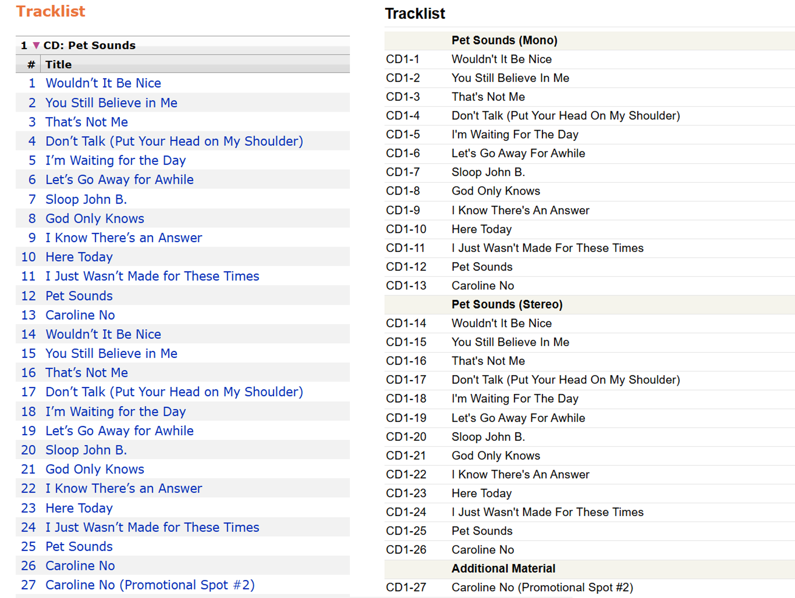 user24 313 Posted July 21, 2025 Posted July 21, 2025 Having a Disc Subtitle field next to the existing Disc Number field is a great suggestion and being able to import the info from the relevant embedded metadata tag(s) would be even better! I’ve read many of the older forum posts about this, which I mostly agree with, but I think there is one aspect that hasn’t been fully discussed… While some of my multi-disc albums have a separate subtitle for the individual discs, I also have many album re-releases (single-disc, multi-disc, bonus tracks, deluxe edition, anniversary edition, box set) where there is more than one subtitle per disc. An example is Pet Sounds [50th Anniversary Edition] where some numbered discs have several subtitles: With this example (plus many others I have looked at), MusicBrainz (LHS image below) groups the tracks by Disc Number, however Discogs (RHS image below) groups the tracks by Disc Subtitle: https://musicbrainz.org/release/b5474125-17b3-4893-ba39-267b28ba9fb3 https://www.discogs.com/release/8738209-The-Beach-Boys-Pet-Sounds I sightly prefer the Discogs method, but each has pros and cons. Therefore, perhaps Emby could consider both methods for any possible future implementation? (Or maybe grouping by Both rather than just Disc Number.) Some sort of Group By: None | Disc Number | Disc Subtitle | Both would allow for ultimate flexibility, but I would be quite happy with even just a basic Disc Subtitle field, as suggested by others already. If this field/tag was available, it would be very useful for at least showing the titles and (if wanted) alternative track groupings could then potentially be further customized with creative tagging and basic CSS… Having different track grouping options may also be useful for Classical Music and Audiobooks? Thanks for considering! 1