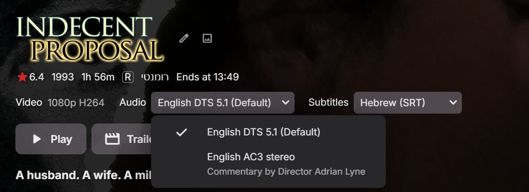 Solution Luke 42078 Posted February 26, 2025 Solution Posted February 26, 2025 7 minutes ago, LoLoEmby said: It somehow stays the same More than that, when I trying to switch to the other source audio, no change. still playing the same audio track. I tried different movie with English and Hebrew DUB, when I start the movie, it always plays the Hebrew no matther if I choose English in the menu or change in the player itself. This could be playing a role in your issue: