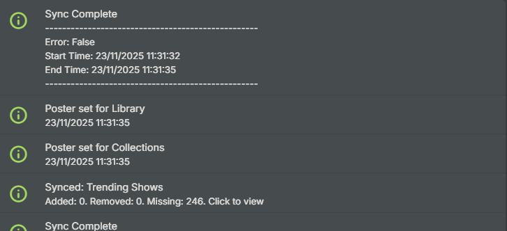 Amything 122 Posted November 18, 2025 Author Posted November 18, 2025 20 hours ago, Halliphax said: I have subscribed to three collections (IMDB and Trending Shows and Movies). However, the last sync that was performed has wiped the pictures I had for my Library, LiveTV and Collections (the pictures were the default generated Emby ones). How can I reverse this and can I stop it from happening in future? It's not intended for Library images to be touched unless you set new ones on ACdb.tv. I'll look into why this happened, sorry about the bother. 1
