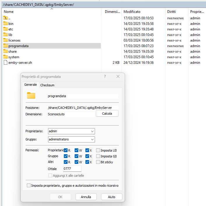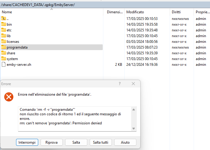 mysteremby 0 Posted March 17, 2025 Posted March 17, 2025 Ho provato a cancellare con il profilo admin tramite Putty la cartella "/share/CACHEDEV1_DATA/.qpkg/EmbyServer/programdata" che mi hai indicato, ma questo non è possibile. Ho potuto solamente svuotarla ma non eliminarla come vedi dalle immagini allegate. Se non trovo altre soluzioni dovrò provare a disinstallare il server e poi reinstallarlo da zero. Certo però che partiamo bene, ho pagato per una licenza life e mi trovo dopo qualche mese a ripartire da zero... Ma... non esiste una assistenza diretta Emby? solamente una comunity di utenti che si aiuta tra loro? Grazie mille e di nuovo buona girnata