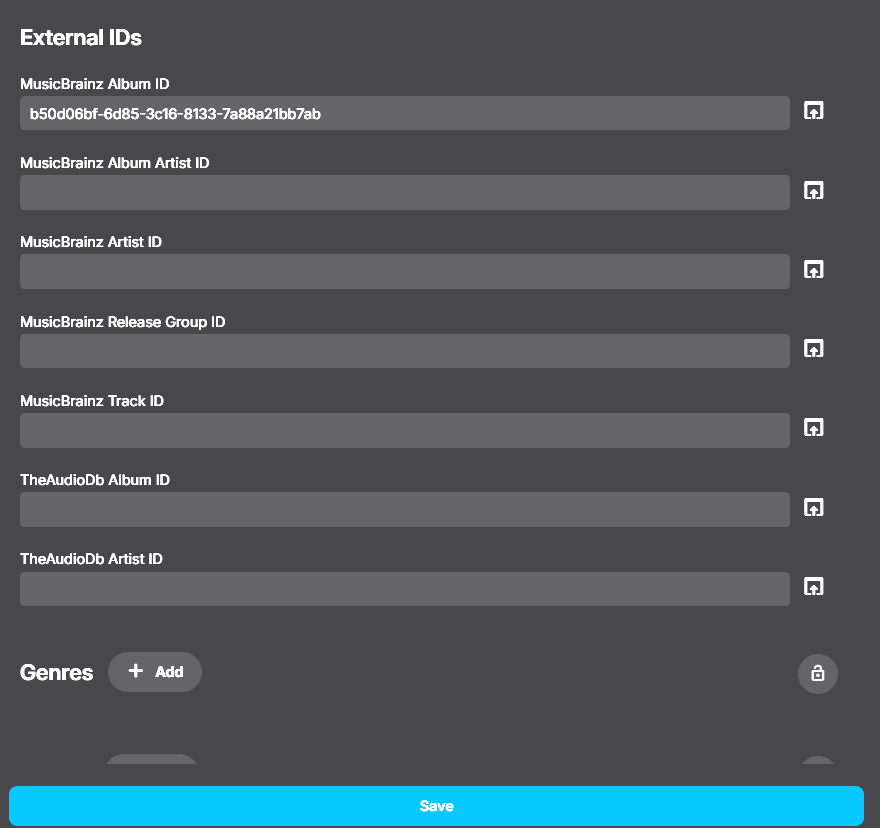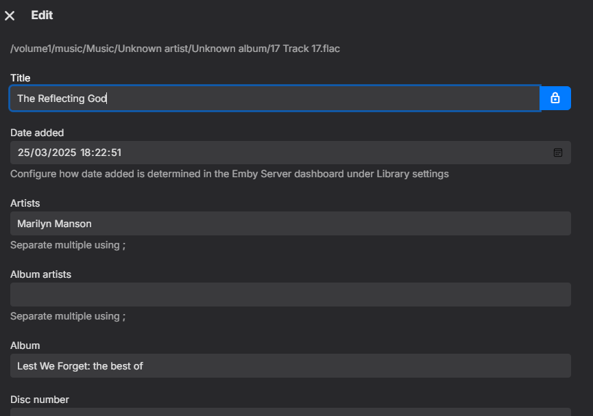 Kanejo79 1 Posted March 28, 2025 Posted March 28, 2025 (edited) Hi there, I recently uploaded an album to my Synology Emby server and no metadata was found. This also occurred on Windows media player so I wasn't surprised. However, I thought after finding and adding the MusicBrainz album ID, emby would be able to fill in the gaps. Unfortunately, after refreshing the library this did not occur. I then decided to add other metadata myself, artist and album. Emby was then able to add the tracks to the Artist, however it does not seem to be able to add them to an album, so each track is just individually listed and can't be played as an album. Is this a bug? should the MusicBrainz album ID fill in the gaps in Metadata? (the album exists on MusicBrainz) After adding the album name, why doesn't this put the songs together as an album? Edited March 28, 2025 by Kanejo79
